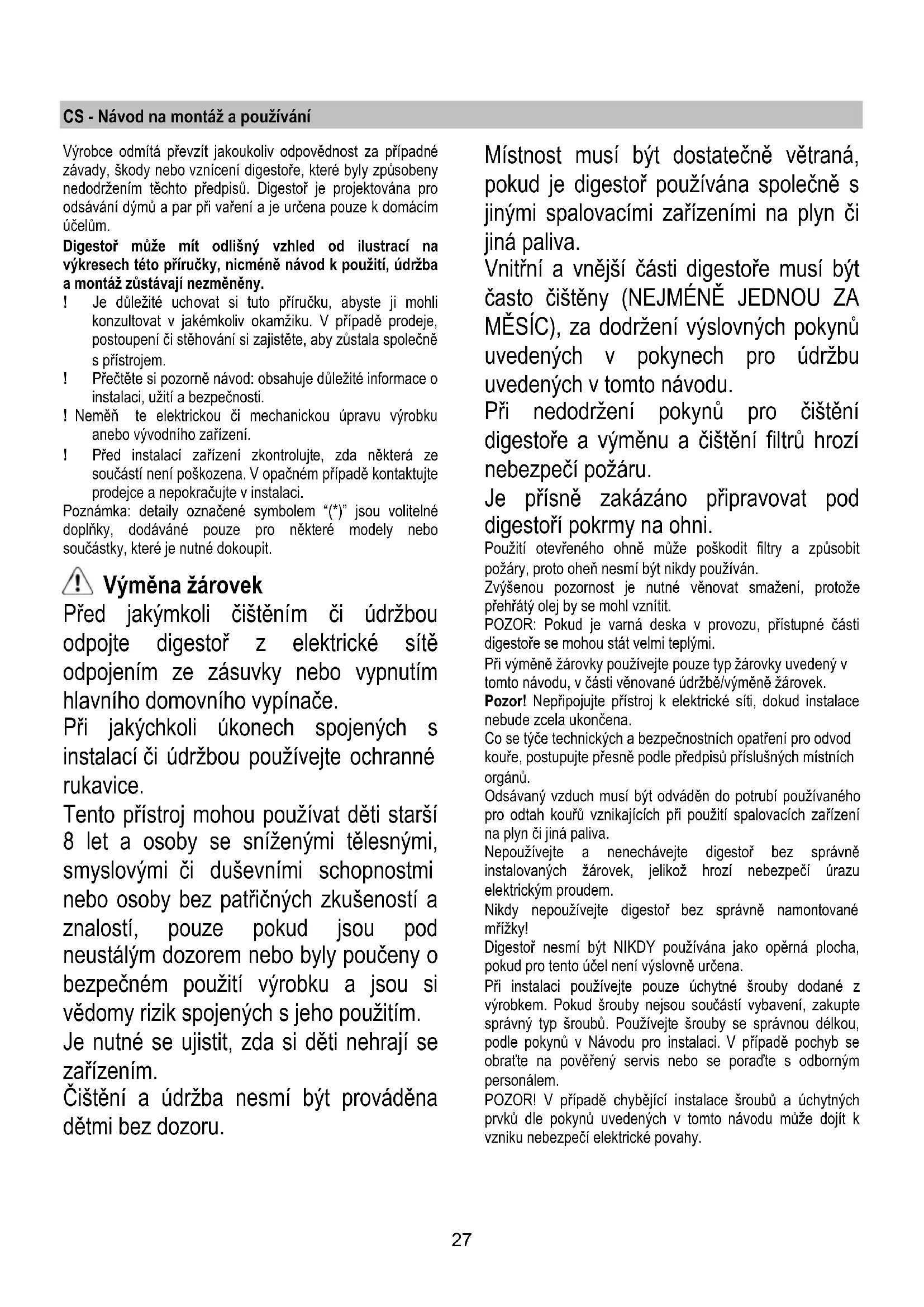 - Para desmontar o filtro proceder em sentido inverso. Filtro de carvão ativo NÃO lavável A saturação do filtro de carvão ativado verifica-se após um uso mais ou menos prolongado, em função do tipo de cozinha e da regularidade da limpeza do filtro de gorduras. Em todo caso, é necessário substituir o cartucho no máximo cada 4 meses. NÃO pode ser lavado ou regenerado. Montagem: Aganche o filtro de carvão ativo, primeiro na parte de trás da lingueta metálica do exaustor e depois na parte dianteira com os dois botões. Desmontagem: Remova o filtro de carvão ativo rodando de 90º os botões que o fixa ao exaustor. Substituição das lâmpadas O exaustor é dotado de um sistema de iluminação baseada na tecnologia LED. Os LED garantem uma iluminação melhor e uma duração de até 10 vezes maior que as lâmpadas tradicionais e economizam 90% de energia elétrica. Para a substituição, contatar o serviço de assistência técnica.27 CS - Návod na montáž a používání Výrobce odmítá převzít jakoukoliv odpovědnost za případné závady, škody nebo vznícení digestoře, které byly způsobeny nedodržením těchto předpisů. Digestoř je projektována pro odsávání dýmů a par při vaření a je určena pouze k domácím účelům. Digestoř může mít odlišný vzhled od ilustrací na výkresech této příručky, nicméně návod k použití, údržba a montáž zůstávají nezměněny. ! Je důležité uchovat si tuto příručku, abyste ji mohli konzultovat v jakémkoliv okamžiku. V případě prodeje, postoupení či stěhování si zajistěte, aby zůstala společně s přístrojem. ! Přečtěte si pozorně návod: obsahuje důležité informace o instalaci, užití a bezpečnosti. ! Neměň te elektrickou či mechanickou úpravu výrobku anebo vývodního zařízení. ! Před instalací zařízení zkontrolujte, zda některá ze součástí není poškozena. V opačném případě kontaktujte prodejce a nepokračujte v instalaci. Poznámka: detaily označené symbolem “(*)” jsou volitelné doplňky, dodáváné pouze pro některé modely nebo součástky, které je nutné dokoupit. Výměna žárovek Před jakýmkoli čištěním či údržbou odpojte digestoř z elektrické sítě odpojením ze zásuvky nebo vypnutím hlavního domovního vypínače. Při jakýchkoli úkonech spojených s instalací či údržbou používejte ochranné rukavice. Tento přístroj mohou používat děti starší 8 let a osoby se sníženými tělesnými, smyslovými či duševními schopnostmi nebo osoby bez patřičných zkušeností a znalostí, pouze pokud jsou pod neustálým dozorem nebo byly poučeny o bezpečném použití výrobku a jsou si vědomy rizik spojených s jeho použitím. Je nutné se ujistit, zda si děti nehrají se zařízením. Čištění a údržba nesmí být prováděna dětmi bez dozoru. Místnost musí být dostatečně větraná, pokud je digestoř používána společně s jinými spalovacími zařízeními na plyn či jiná paliva. Vnitřní a vnější části digestoře musí být často čištěny (NEJMÉNĚ JEDNOU ZA MĚSÍC), za dodržení výslovných pokynů uvedených v pokynech pro údržbu uvedených v tomto návodu. Při nedodržení pokynů pro čištění digestoře a výměnu a čištění filtrů hrozí nebezpečí požáru. Je přísně zakázáno připravovat pod digestoří pokrmy na ohni. Použití otevřeného ohně může poškodit filtry a způsobit požáry, proto oheň nesmí být nikdy používán. Zvýšenou pozornost je nutné věnovat smažení, protože přehřátý olej by se mohl vznítit. POZOR: Pokud je varná deska v provozu, přístupné části digestoře se mohou stát velmi teplými. Při výměně žárovky používejte pouze typ žárovky uvedený v tomto návodu, v části věnované údržbě/výměně žárovek. Pozor! Nepřipojujte přístroj k elektrické síti, dokud instalace nebude zcela ukončena. Co se týče technických a bezpečnostních opatření pro odvod kouře, postupujte přesně podle předpisů příslušných místních orgánů. Odsávaný vzduch musí být odváděn do potrubí používaného pro odtah kouřů vznikajících při použití spalovacích zařízení na plyn či jiná paliva. Nepoužívejte a nenechávejte digestoř bez správně instalovaných žárovek, jelikož hrozí nebezpečí úrazu elektrickým proudem. Nikdy nepoužívejte digestoř bez správně namontované mřížky! Digestoř nesmí být NIKDY používána jako opěrná plocha, pokud pro tento účel není výslovně určena. Při instalaci používejte pouze úchytné šrouby dodané z výrobkem. Pokud šrouby nejsou součástí vybavení, zakupte správný typ šroubů. Používejte šrouby se správnou délkou, podle pokynů v Návodu pro instalaci. V případě pochyb se obraťte na pověřený servis nebo se poraďte s odborným personálem. POZOR! V případě chybějící instalace šroubů a úchytných prvků dle pokynů uvedených v tomto návodu může dojít k vzniku nebezpečí elektrické povahy.28 Tento spotřebič je označený v souladu s evropskou směrnicí 2012/19/EC o likvidaci elektrického a elektronického zařízení (WEEE). Zajištěním správné likvidace tohoto výrobku pomůžete zabránit případným negativním důsledkům na životní prostředí a lidské zdraví, ke kterým by nevhodnou likvidací tohoto výrobku mohlo dojít. Symbol na výrobku nebo na dokumentech přiložených k výrobku udává, že tento spotřebič nepatří do domácího odpadu. Spotřebič je nutné odvézt do sběrného místa pro recyklaci elektrického a elektronického zařízení. Likvidace musí být provedena v souladu s místními předpisy o ochraně životního prostředí, které se týkají likvidace odpadu. Podrobnější informace o zpracování, rekuperaci a recyklaci tohoto výrobku zjistíte u příslušného místního úřadu, služby pro likvidaci domovního odp