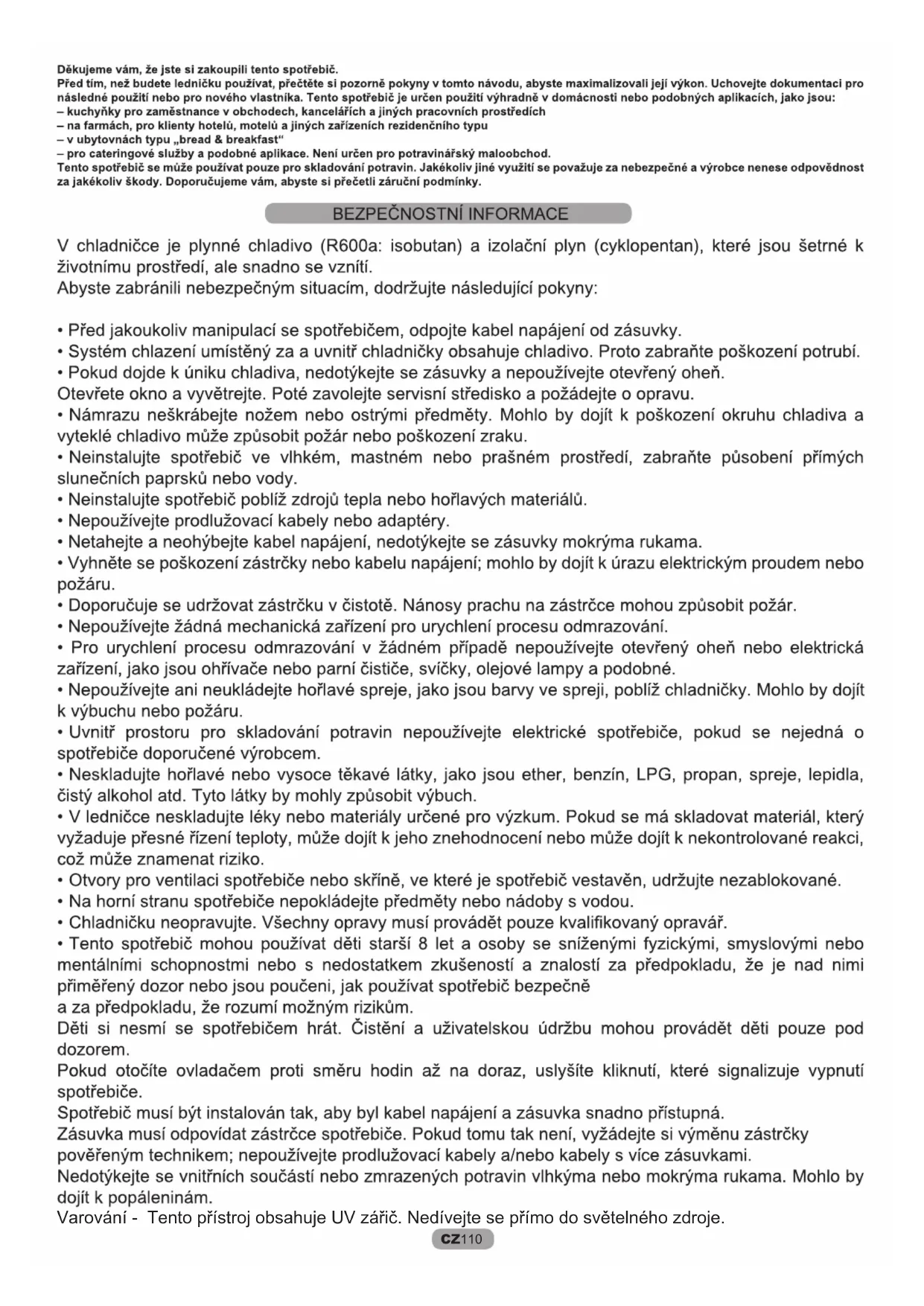 CZ 109CZ 110 Varování - Tento přístroj obsahuje UV zářič. Nedívejte se přímo do světelného zdroje.CZ 111 Odstraňte veškerý obalový materiál uvnitř spotřebiče a vyčistěte vodou s jedlou sodou nebo neutrálním mýdlem. stabilizovala na normální provozní teplotu. Teprve poté vložte čerstvé nebo zmrazené potraviny. VAROVÁNÍ: