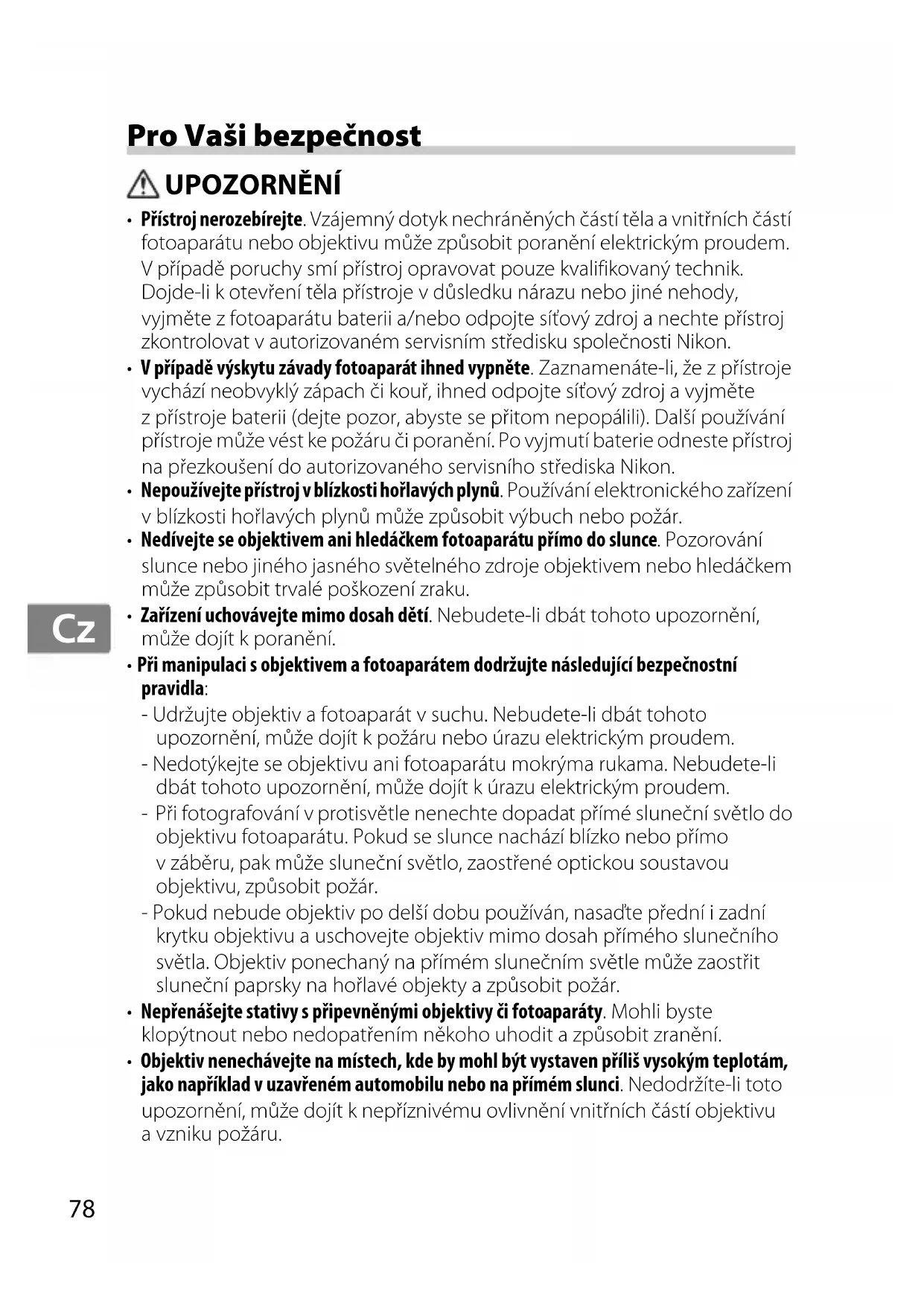 - Přístroj nerozebírejte. Vzájemný dotyk nechráněných částí těla a vnitřních částí fotoaparátu nebo objektivu může způsobit poranění elektrickým proudem. V případě poruchy smí přístroj opravovat pouze kvalifikovaný technik. Dojde-li k otevření těla přístroje v důsledku nárazu nebo jiné nehody, vyjměte z fotoaparátu baterii a/nebo odpojte síťový zdroj a nechte přístroj zkontrolovat v autorizovaném servisním středisku společnosti Nikon.