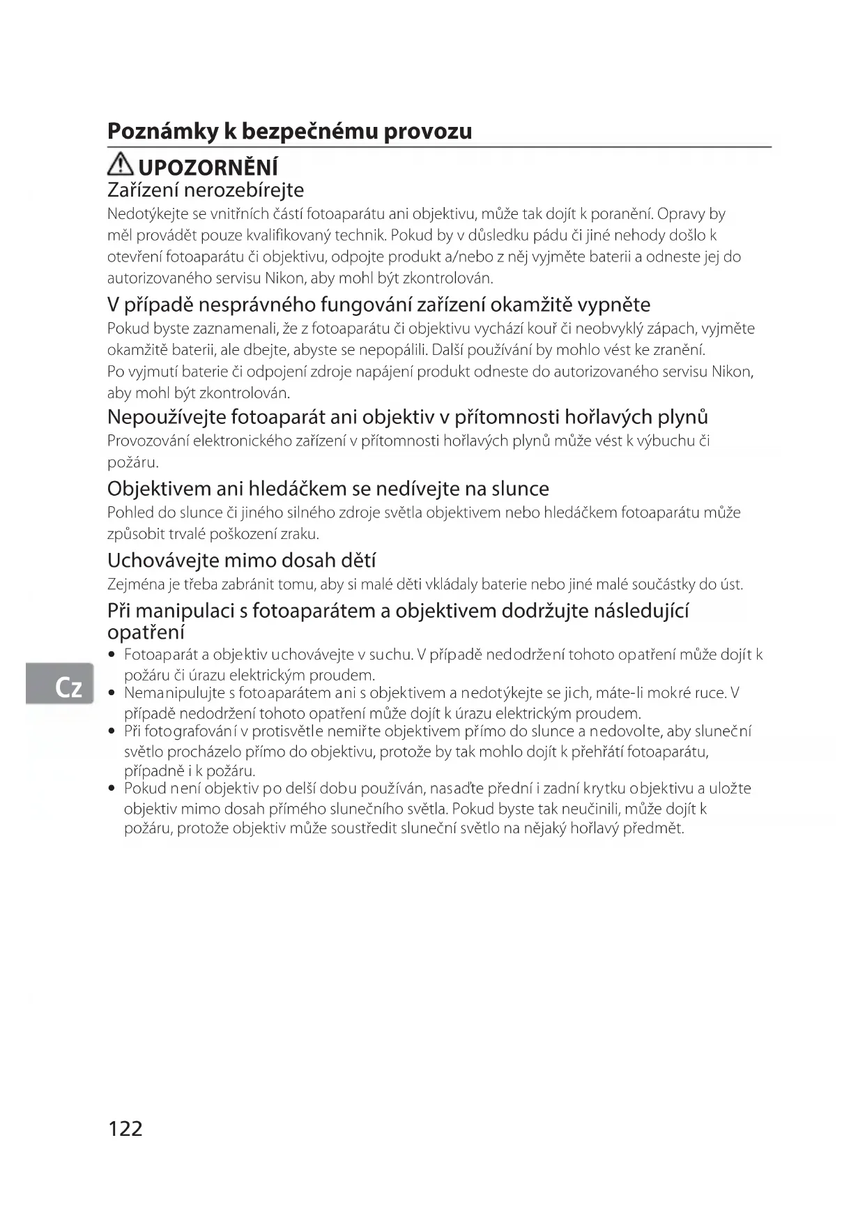 Poznámky k bezpečnému provozu UPOZORNĚNÍ Zařízení nerozebírejte Nedotýkejte se vnitřních částí fotoaparátu ani objektivu, může tak dojít k poranění. Opravy by měl provádět pouze kvalifikovaný technik. Pokud by v důsledku pádu či jiné nehody došlo k otevření fotoaparátu či objektivu, odpojte produkt a/nebo z něj vyjměte baterii a odneste jej do autorizovaného servisu Nikon, aby mohl být zkontrolován. V případě nesprávného fungování zařízení okamžitě vypněte Pokud byste zaznamenali, že z fotoaparátu či objektivu vychází kouř či neobvyklý zápach, vyjměte okamžitě baterii, ale dbejte, abyste se nepopálili. Další používání by mohlo vést ke zranění. Po vyjmutí baterie či odpojení zdroje napájení produkt odneste do autorizovaného servisu Nikon, aby mohl být zkontrolován. Nepoužívejte fotoaparát ani objektiv v přítomnosti hořlavých plynů Provozování elektronického zařízení v přítomnosti hořlavých plynů může vést k výbuchu či požáru. Objektivem ani hledáčkem se nedívejte na slunce Pohled do slunce či jiného silného zdroje světla objektivem nebo hledáčkem fotoaparátu může způsobit trvalé poškození zraku. Uchovávejte mimo dosah dětí Zejména je třeba zabránit tomu, aby si malé děti vkládaly baterie nebo jiné malé součástky do úst. Při manipulaci s fotoaparátem a objektivem dodržujte následující opatření