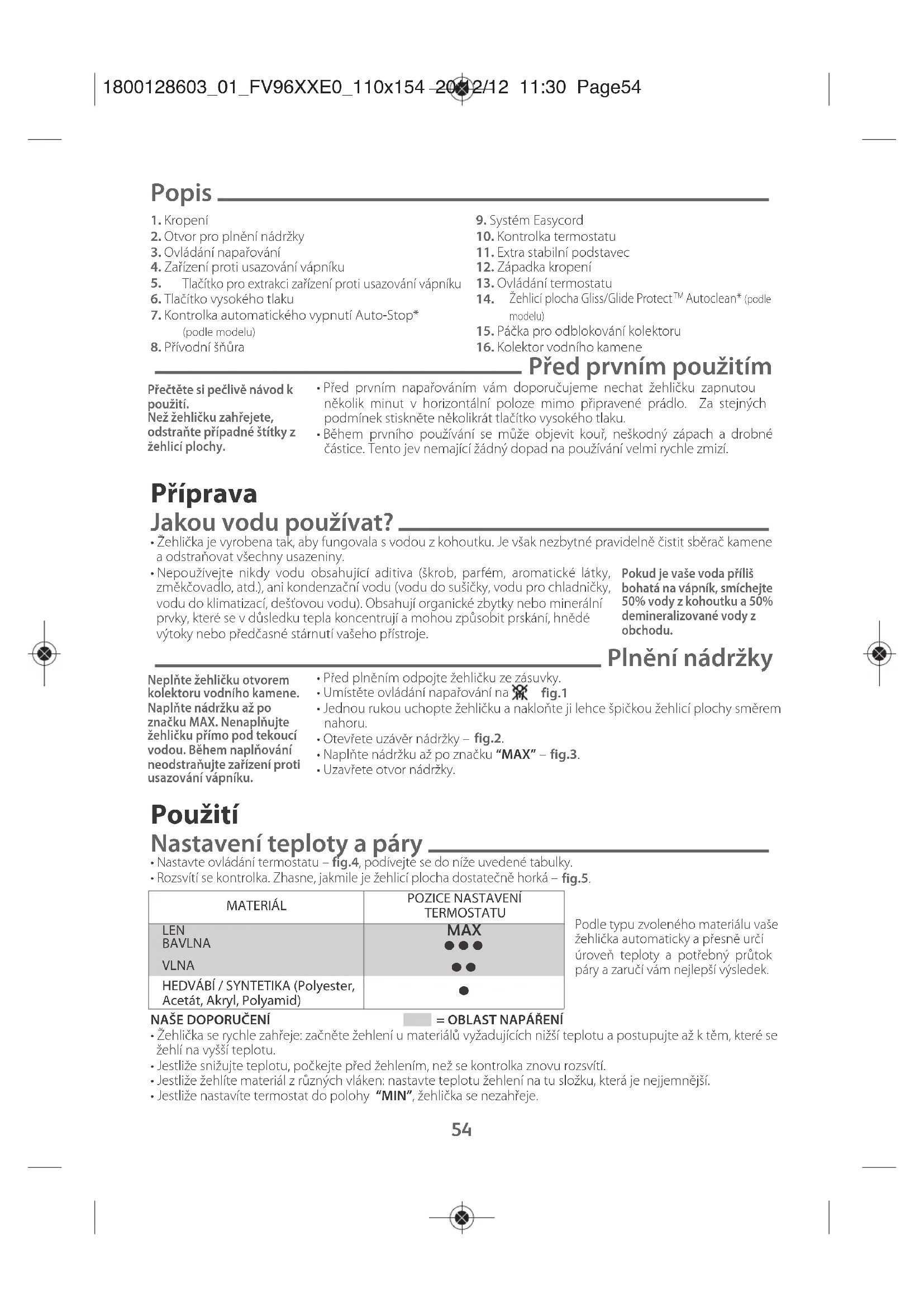 V případě dalších problémů se obraťte na licenční středisko, kde vám žehličku zkontrolují. Máte nějaké potíže se žehličkou? Ochrana Ïivotního prostfiedí je prioritou! Spotfiebiã obsahuje mnoho cenného recyklovatelného materiálu. Odevzdejte jej do sbûrného místa odpadu, aby do‰lo k jeho zpracování. 1800128603_01_FV96XXE0_110x154 20/12/12 11:31 Page5758 Opis