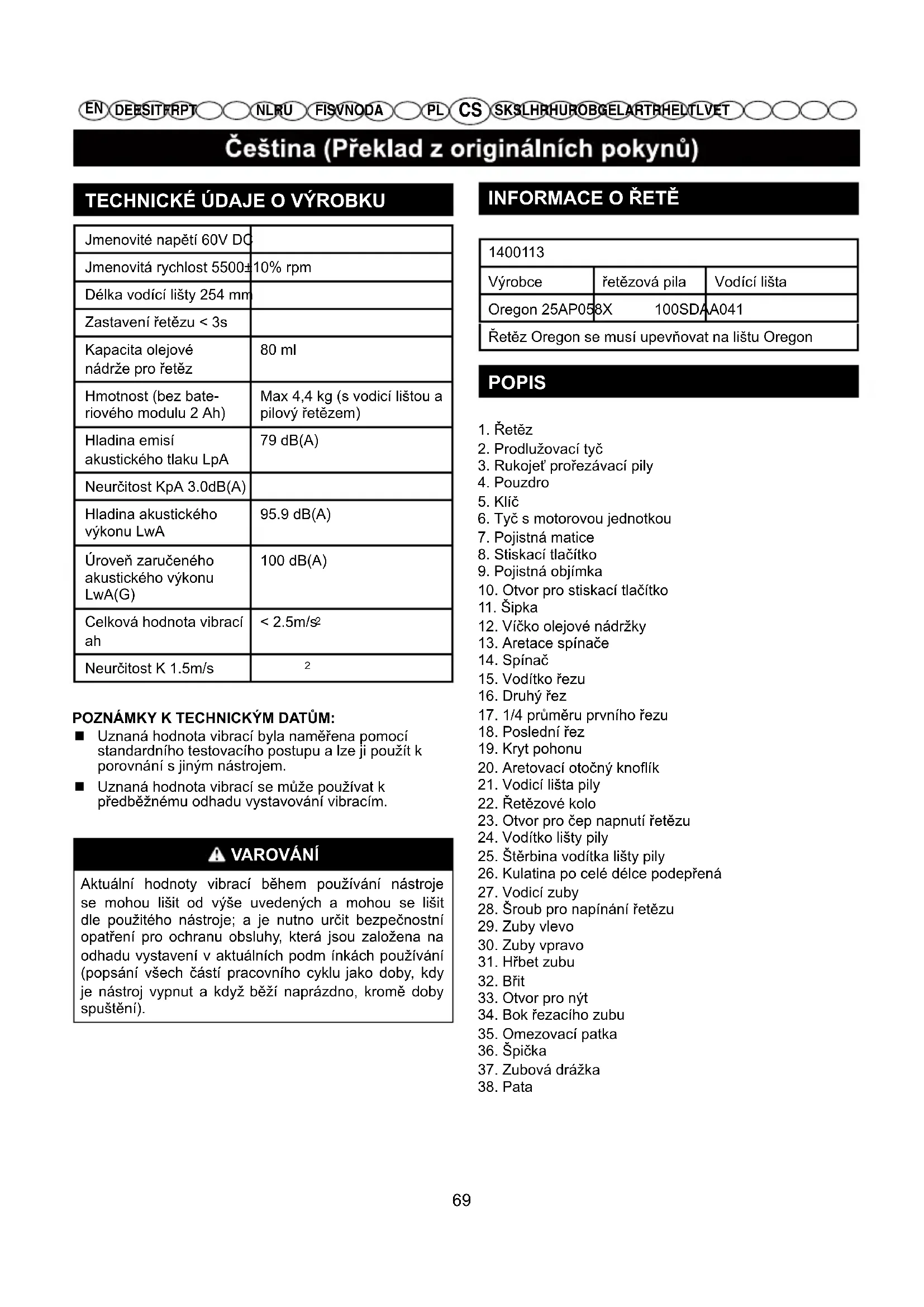 1400113Výrobce řetězová pila Vodící lištaOregon 25AP058X 100SDAA041Řetěz Oregon se musí upevňovat na lištu Oregon POPIS 1. Řetěz2. Prodlužovací tyč3. Rukojeť prořezávací pily4. Pouzdro5. Klíč6. Tyč s motorovou jednotkou7. Pojistná matice8. Stiskací tlačítko9. Pojistná objímka10. Otvor pro stiskací tlačítko11. Šipka12. Víčko olejové nádržky13. Aretace spínače14. Spínač15. Vodítko řezu16. Druhý řez17. 1/4 průměru prvního řezu18. Poslední řez19. Kryt pohonu20. Aretovací otočný knoík21. Vodicí lišta pily22. Řetězové kolo23. Otvor pro čep napnutí řetězu24. Vodítko lišty pily25. Štěrbina vodítka lišty pily26. Kulatina po celé délce podepřená27. Vodicí zuby28. Šroub pro napínání řetězu29. Zuby vlevo30. Zuby vpravo31. Hřbet zubu32. Břit33. Otvor pro nýt34. Bok řezacího zubu35. Omezovací patka36. Špička37. Zubová drážka38. Pata 69PL