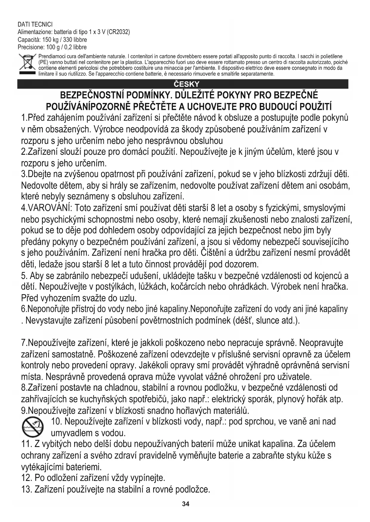 - Pulire la bilancia pesapersone con un panno asciutto o leggermente bagnato. MESSAGGI a – batteria scarica b – troppo carico sulla bilancia pesapersone34 DATI TECNICI Alimentazione: batteria di tipo 1 x 3 V (CR2032) ČESKY BEZPEČNOSTNÍ PODMÍNKY. DŮLEŽITÉ POKYNY PRO BEZPEČNÉ POUŽÍVÁNÍPOZORNĚ PŘEČTĚTE A UCHOVEJTE PRO BUDOUCÍ POUŽITÍ 1.Před zahájením používání zařízení si přečtěte návod k obsluze a postupujte podle pokynů v něm obsažených. Výrobce neodpovídá za škody způsobené používáním zařízení v rozporu s jeho určením nebo jeho nesprávnou obsluhou 2.Zařízení slouží pouze pro domácí použití. Nepoužívejte je k jiným účelům, které jsou v rozporu s jeho určením. 3.Dbejte na zvýšenou opatrnost při používání zařízení, pokud se v jeho blízkosti zdržují děti. Nedovolte dětem, aby si hrály se zařízením, nedovolte používat zařízení dětem ani osobám, které nebyly seznámeny s obsluhou zařízení. 4.VAROVÁNÍ: Toto zařízení smí používat děti starší 8 let a osoby s fyzickými, smyslovými nebo psychickými schopnostmi nebo osoby, které nemají zkušenosti nebo znalosti zařízení, pokud se to děje pod dohledem osoby odpovídající za jejich bezpečnost nebo jim byly předány pokyny o bezpečném používání zařízení, a jsou si vědomy nebezpečí souvisejícího s jeho používáním. Zařízení není hračka pro děti. Čištění a údržbu zařízení nesmí provádět děti, ledaže jsou starší 8 let a tuto činnost provádějí pod dozorem.