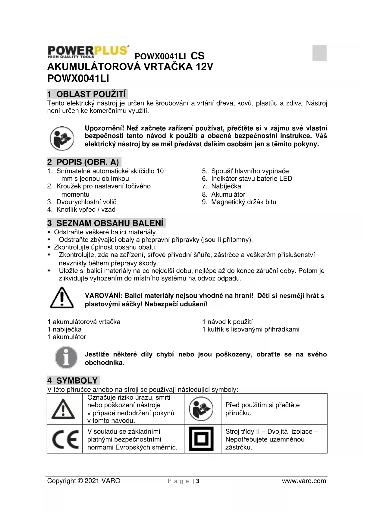 Stroj třídy II – Dvojitá izolace – Nepotřebujete uzemněnou zástrčku.POWX0041LI CS Copyright © 2021 VARO P a g e | 4 www.varo.com