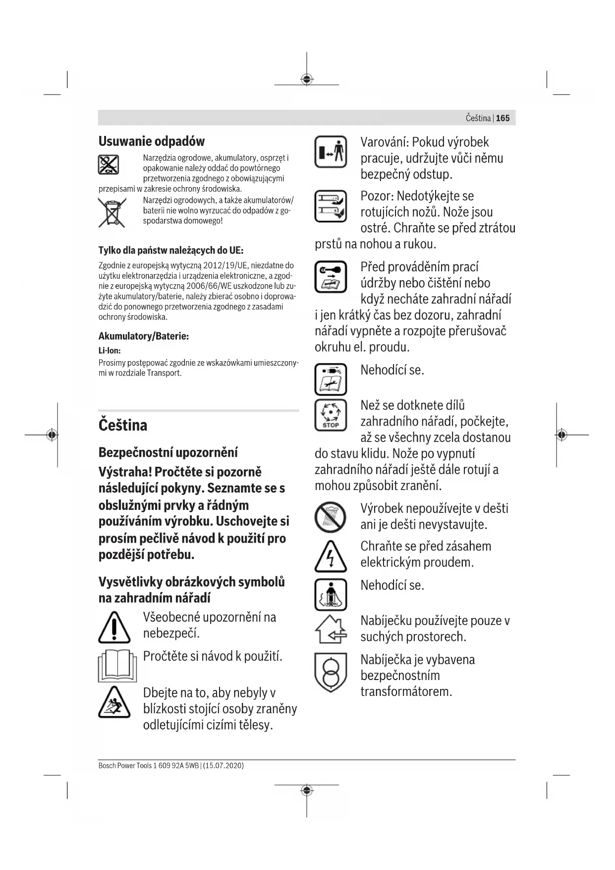i/lub silnik pracuje ciężko Za nisko ustawiona wysokość cięcia Zwiększyć wysokość cięcia Tępy nóż Wymienić nóż (zob. rys. K) Możliwość zablokowania maszyny wyrzucanym materiałem Wyłączyć narzędzie ogrodowe i zwolnić przery- wacz obwodu elektrycznego Skontrolować spód narzędzia ogrodowego i w ra- zie potrzeby oczyścić (koniecznie stosować ręka- wice ochronne) Nóż został odwrotnie zamontowany Właściwie osadzić nóż Po włączeniu narzędzia ogrodowego, nóż nie obraca się Nóż zablokowany trawą Wyłączyć narzędzie ogrodowe i zwolnić przery- wacz obwodu elektrycznego Usunąć zablokowany materiał (zawsze stosować rękawice ogrodowe) Niedokręcona śruba/nakrętka noża Dokręcić śrubę/nakrętkę noża (27Nm) Silne wibracje/dźwięki Niedokręcona śruba/nakrętka noża Dokręcić śrubę/nakrętkę noża (27Nm) Uszkodzony nóż Wymienić nóż (zob. rys. K) Bosch Power Tools 1 609 92A 5WB | (15.07.2020)164 | Polski Akumulator i ładowarka Symptomy Możliwa przyczyna Rozwiązanie Czerwony wskaźnik na- ładowania akumulatora miga Ładowanie nie jest możliwe Akumulator nie został (właściwie) umieszczony we wnęce Umieścić akumulator prawidłowo na ładowarce Styki akumulatora są zabrudzone Wyczyścić styki akumulatora, np. przez wielokrot- ne włożenie i wyjęcie akumulatora. W razie niepo- wodzenia akumulator wymienić na nowy Akumulator jest uszkodzony Wymienić akumulator na nowy Wskaźnik ładowania na ładowarce nie świeci się Wtyczka ładowarki nie/niewłaściwie podłączona do sieci Wsadzić wtyczkę (całkowicie) do gniazdka Gniazdko, przewód sieciowy lub ładowarka są uszkodzone Sprawdzić napięcie sieci, ładowarkę, a w razie potrzeb zlecić kontrolę w autoryzowanym punkcie serwisowym elektronarzędzi firmy Bosch Konserwacja i serwis Pielęgnacja akumulatora u Uwaga! Przed przystąpieniem do regulacji i czyszcze- nia narzędzia ogrodowego, należy zwolnić przerywacz obwodu elektrycznego i wyjąć z narzędzia akumula- tor, jak również zdemontować worek na trawę. u Podczas wykonywania prac obsługowych w pobliżu ostrych noży, należy zawsze nosić rękawice ogrodo- we. Aby zapewnić optymalne wykorzystanie akumulatora, należy przestrzegać następujących wskazówek i zaleceń: – Akumulator należy chronić przed wilgocią i kontaktem z wodą. – Narzędzie ogrodowe oraz akumulator należy przechowy- wać w zakresie temperatur pomiędzy 20°C i 50 °C. Aku- mulatora nie należy na przykład pozostawiać latem w sa- mochodzie. – Akumulator należy przechowywać oddzielnie. Nie prze- chowywać narzędzia ogrodowego z osadzonym akumula- torem. – Jeżeli narzędzie ogrodowe poddane jest bezpośrednim promieniom słońca, nie należy pozostawiać w nim akumu- latora. – Optymalna temperatura przechowywania akumulatora wynosi 5C. – Otwory wentylacyjne należy regularnie czyścić za pomocą miękkiego, czystego i suchego pędzelka. Wyraźnie skrócony czas użytkowania akumulatora po nała- dowaniu świadczy o tym, że akumulator jest zużyty i trzeba go wymienić. Obsługa klienta oraz doradztwo dotyczące użytkowania Ze wszystkimi pytaniami, dotyczącymi naprawy ikonserwa- cji nabytego produktu oraz dostępu do części zamiennych, prosimy zwracać się do punktów obsługi klienta. Rysunki techniczne oraz informacje o częściach zamiennych można znaleźć pod adresem: www.bosch-pt.com Nasz zespół doradztwa dotyczącego użytkowania odpowie na wszystkie pytania związane z produktami firmy Bosch oraz ich osprzętem. Przy wszystkich zgłoszeniach oraz zamówieniach części za- miennych konieczne jest podanie 10‑cyfrowego numeru ka- talogowego, znajdującego się na tabliczce znamionowej pro- duktu. Polska Robert Bosch Sp. z o.o. Serwis Elektronarzędzi Ul. Jutrzenki 102/104 02-230 Warszawa Na www.serwisbosch.com znajdą Państwo wszystkie szcze- góły dotyczące usług serwisowych online. Tel.: 22 7154450 Faks: 22 7154440 E-Mail: bsc@pl.bosch.com www.bosch-pt.pl Pozostałe adresy serwisów znajdują się na stronie: www.bosch-pt.com/serviceaddresses Transport Załączone w dostawie akumulatory litowo jonowe podlegają wymaganiom przepisów dotyczących towarów niebezpiecz- nych. Akumulatory mogą być transportowane drogą lądową przez użytkownika bez konieczności spełnienia jakichkol- wiek dalszych warunków. W przypadku przesyłki przez osoby trzecie (np. transport drogą powietrzną lub za pośrednictwem firmy spedycyjnej) należy dostosować się do szczególnych wymogów dotyczą- cych opakowania i znaczenia towaru. W takim wypadku pod- czas przygotowywania towaru do wysyłki należy skonsulto- wać się z ekspertem d/s towarów niebezpiecznych. Akumulatory można wysyłać tylko wówczas, gdy ich obudo- wa nie jest uszkodzona. Odsłonięte styki należy zakleić, a akumulator zapakować w taki sposób, aby nie mógł on się poruszać (przesuwać) w opakowaniu. Należy wziąć też pod uwagę ewentualne przepisy prawa krajowego. 1 609 92A 5WB | (15.07.2020) Bosch Power ToolsČeština | 165 Usuwanie odpadów Narzędzia ogrodowe, akumulatory, osprzęt i opakowanie należy oddać do powtórnego przetworzenia zgodnego z obowiązującymi przepisami w zakresie ochrony środowiska. Narzędzi ogrodowych, a także akumulatorów/ baterii nie wolno wyrzucać do odpadów z go- spodarstwa domowego! Tylko dla państw należących doUE: Zgodnie z europejską wytyczną 2012/19/UE, niezdatne do użytku elektronarzędzia i urządzenia elektroniczne, a zgod- nie z europejską wytyczną 2006/66/WE uszkodzone lub zu- żyte akumulatory/baterie, należy zbierać osobno i doprowa- dzić do ponownego przetworzenia zgodnego z zasadami ochrony środowiska. Akumulatory/Baterie: Li-Ion: Prosimy postępować zgodnie ze wskazówkami umieszczony- mi w rozdziale Transport. Čeština Bezpečnostní upozornění Výstraha! Pročtěte si pozorně následující pokyny. Seznamte se s obslužnými prvky a řádným pou