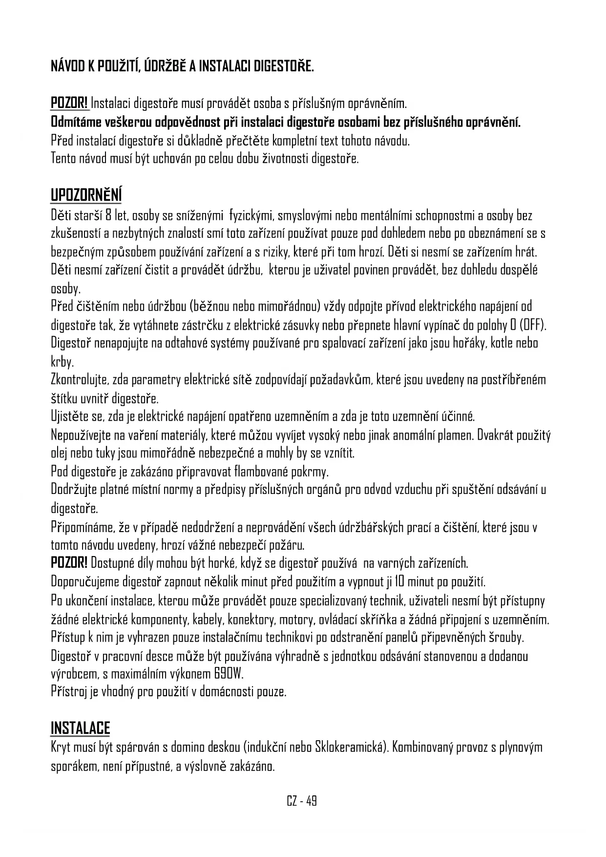 Antes de efectuar cualquier intervención de limpieza y mantenimiento, corte la alimentación de la campana poniendo el interruptor general en en posición 0 ( OFF ).ES - 48 Limpieza de los filtros metálicos Los filtros metálicos que acompañan la campana eléctrica deben ser lavados en cada meses en función de la intensidad del uso, con agua caliente y detergente liquido no agresivo. Los filtros metálicos deberían eliminarse mediante la palanca. Después de ser lavodos, los filtros deben estar completamente secos y ser colocados correctamente. Filtros de Carbón OPCIONAL (KFCP y KFCPC) Si la campana eléctrica es utilizada en modo filtrante con reciclaje interno, es necesario colocar filtros de carbón (KFCP y KFCPC). El carbón activo que contienen los filtros, sirve para absorber los olores y los humos resultantes de la elaboración de los alimentos. Limpieza de la campana eléctrica Si la campana eléctrica es embarnizada o revestida en cobre, usar un paño suave con agua tibia y un detergente neutro. No se debe derramar cualquier liquido sobre la campana y no pueden ser usados productos granulosos y/o abrasivos. No use disolventes químicos o derivados del petróleo, ni detergentes con cloro u otras sustancias que puedan tener efectos oxidantes o que puedan provocar manchas irreparables. El fabricante no se responsabiliza por daños estéticos causados por la falta de atención a las indicaciones. Es. KFCPC KFCP KFCPCZ - 49 NÁVOD K POUŽITÍ, ÚDRŽBĚ A INSTALACI DIGESTOŘE. POZOR! Instalaci digestoře musí provádět osoba s příslušným oprávněním. Odmítáme veškerou odpovědnost při instalaci digestoře osobami bez příslušného oprávnění. Před instalací digestoře si důkladně přečtěte kompletní text tohoto návodu. Tento návod musí být uchován po celou dobu životnosti digestoře. UPOZORNĚNÍ Děti starší 8 let, osoby se sníženými fyzickými, smyslovými nebo mentálními schopnostmi a osoby bez zkušeností a nezbytných znalostí smí toto zařízení používat pouze pod dohledem nebo po obeznámení se s bezpečným způsobem používání zařízení a s riziky, které při tom hrozí. Děti si nesmí se zařízením hrát. Děti nesmí zařízení čistit a provádět údržbu, kterou je uživatel povinen provádět, bez dohledu dospělé osoby. Před čištěním nebo údržbou (běžnou nebo mimořádnou) vždy odpojte přívod elektrického napájení od digestoře tak, že vytáhnete zástrčku z elektrické zásuvky nebo přepnete hlavní vypínač do polohy 0 (OFF). Digestoř nenapojujte na odtahové systémy používané pro spalovací zařízení jako jsou hořáky, kotle nebo krby. Zkontrolujte, zda parametry elektrické sítě zodpovídají požadavkům, které jsou uvedeny na postříbřeném štítku uvnitř digestoře. Ujistěte se, zda je elektrické napájení opatřeno uzemněním a zda je toto uzemnění účinné. Nepoužívejte na vaření materiály, které můžou vyvíjet vysoký nebo jinak anomální plamen. Dvakrát použitý olej nebo tuky jsou mimořádně nebezpečné a mohly by se vznítit. Pod digestoře je zakázáno připravovat flambované pokrmy. Dodržujte platné místní normy a předpisy příslušných orgánů pro odvod vzduchu při spuštění odsávání u digestoře. Připomínáme, že v případě nedodržení a neprovádění všech údržbářských prací a čištění, které jsou v tomto návodu uvedeny, hrozí vážné nebezpečí požáru. POZOR! Dostupné díly mohou být horké, když se digestoř používá na varných zařízeních. Doporučujeme digestoř zapnout několik minut před použitím a vypnout ji 10 minut po použití. Po ukončení instalace, kterou může provádět pouze specializovaný technik, uživateli nesmí být přístupny žádné elektrické komponenty, kabely, konektory, motory, ovládací skříňka a žádná připojení s uzemněním. Přístup k nim je vyhrazen pouze instalačnímu technikovi po odstranění panelů připevněných šrouby. Digestoř v pracovní desce může být používána výhradně s jednotkou odsávání stanovenou a dodanou výrobcem, s maximálním výkonem 690W. Přístroj je vhodný pro použití v domácnosti pouze. INSTALACE Kryt musí být spárován s domino deskou (indukční nebo Sklokeramická). Kombinovaný provoz s plynovým sporákem, není přípustné, a výslovně zakázáno.CZ - 50 Po ukončení instalace, kterou může provádět pouze specializovaný technik, uživateli nesmí být přístupny žádné elektrické komponenty, kabely, konektory, motory, ovládací skříňka a žádná připojení s uzemněním. Přístup k nim je vyhrazen pouze instalačnímu technikovi po odstranění panelů připevněných šrouby. Digestoř lze používat ve dvou funkcích: filtrace a odsávání. Pracuje-li digestoř jako recirkulátor vzduchu (filtrační funkce), je nutno použít uhlíkové filtry (viz odstavec UHLÍKOVÉ FILTRY). Pracuje-li digestoř jako odsávač par, čili odvádí filtrovaný vzduch směrem ven, je nutno vybudovat vhodné kompenzační zařízení dle platných norem. Potrubí pro odvod spalin musí mít stejný nebo větší průměr jako sběrné potrubí digestoře. Místnost, ve které je digestoř nainstalována, musí mít dostatečné větrání, pokud se zde současně používa- jí i další zařízení, které využívají plyn a jiné spalovací hmoty.