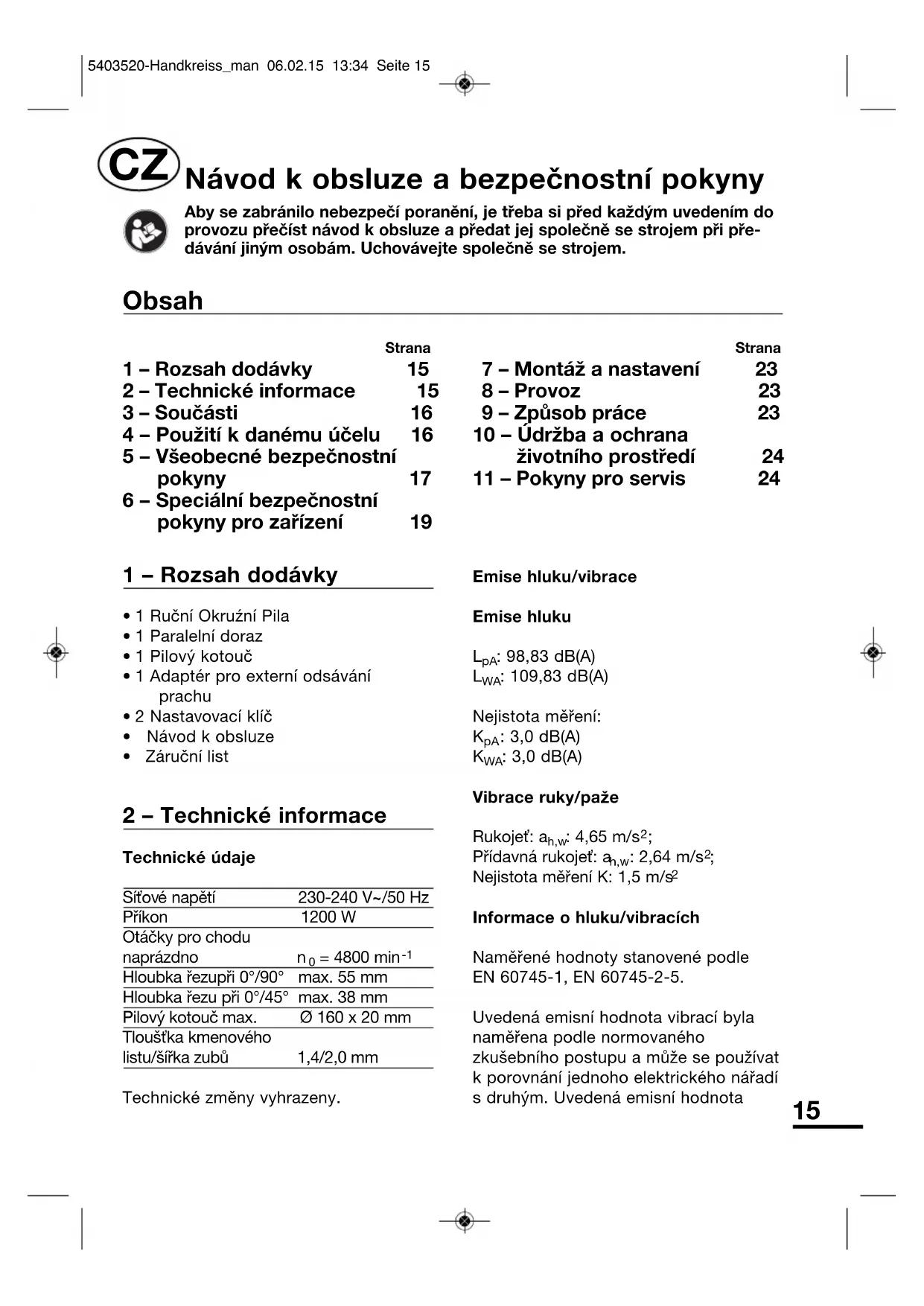 - 1 Ruční Okruźní Pila• 1 Paralelní doraz• 1 Pilový kotouč• 1 Adaptér pro externí odsáváníprachu• 2 Nastavovací klíč• Návod k obsluze• Záruční list 2 – Technické informace Technické údaje Síťové napětí 230-240 V~/50 Hz Příkon 1200 WOtáčky pro chodu naprázdno n = 4800 min Hloubka řezupři 0°/90° max. 55 mmHloubka řezu při 0°/45° max. 38 mmPilový kotouč max. Ø 160 x 20 mmTloušťka kmenovéholistu/šířka zubů 1,4/2,0 mmTechnické změny vyhrazeny.Emise hluku/vibrace Emise hluku