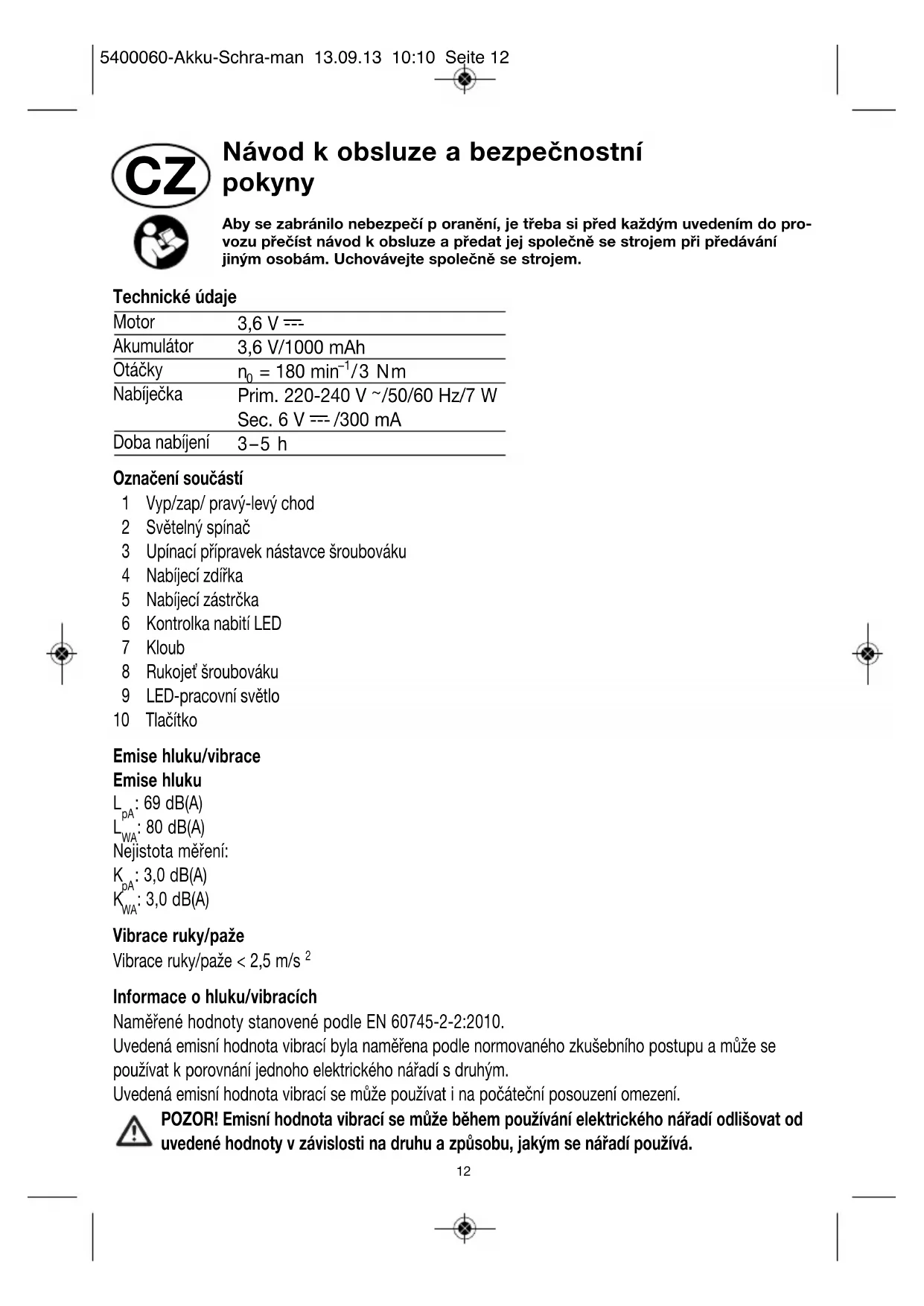 /300 mA Doba nabíjení 3–5 h Označení součástí 1 Vyp/zap/ pravý-levý chod 2 Světelný spínač 3 Upínací přípravek nástavce šroubováku 4 Nabíjecí zdířka 5 Nabíjecí zástrčka 6 Kontrolka nabití LED 7 Kloub 8 Rukojeť šroubováku 9 LED-pracovní světlo 10 Tlačítko Emise hluku/vibrace Emise hluku