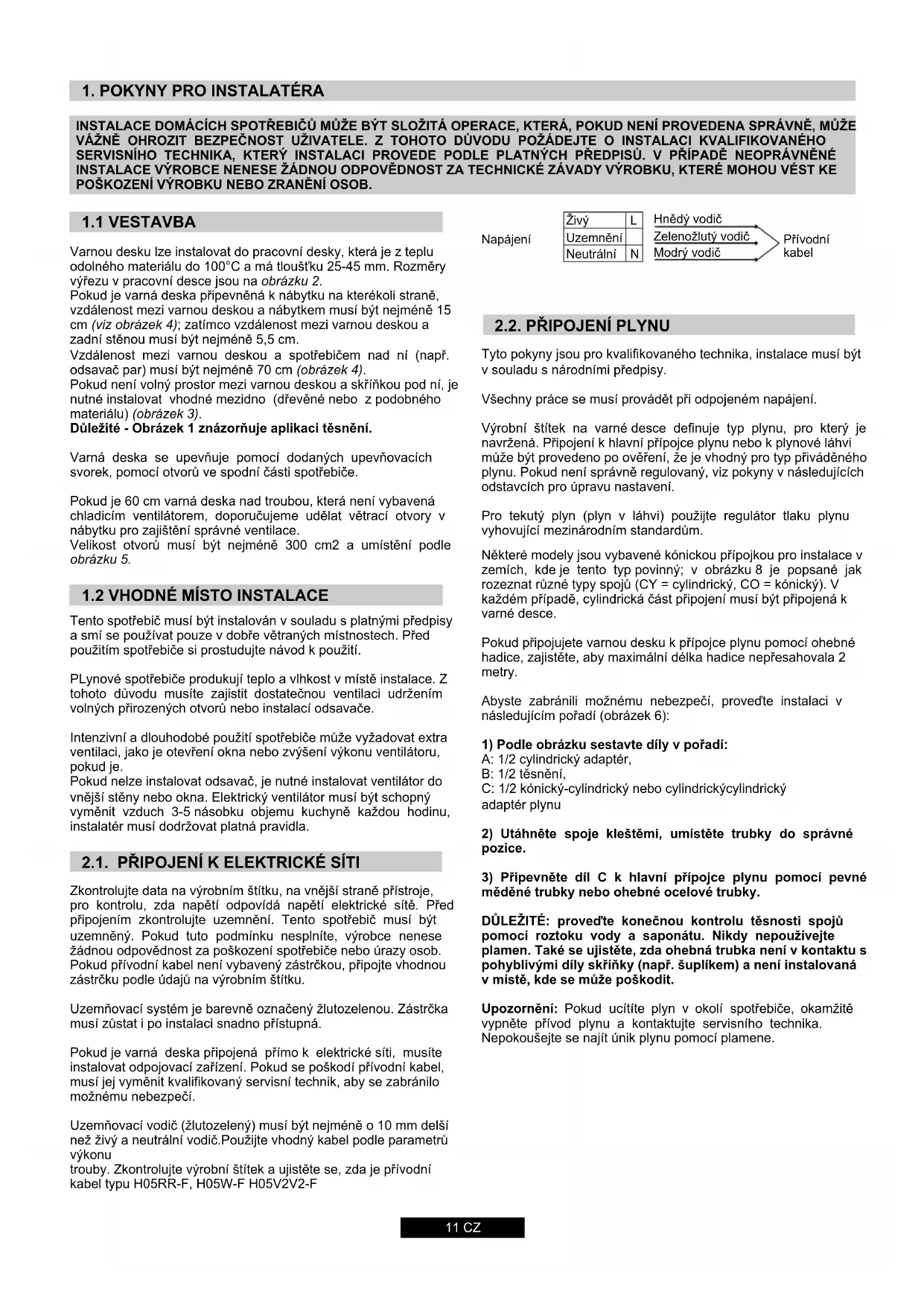 Zkontrolujte data na výrobním štítku, na vnější straně přístroje, pro kontrolu, zda napětí odpovídá napětí elektrické sítě. Před připojením zkontrolujte uzemnění. Tento spotřebič musí být uzemněný. Pokud tuto podmínku nesplníte, výrobce nenese žádnou odpovědnost za poškození spotřebiče nebo úrazy osob. Pokud přívodní kabel není vybavený zástrčkou, připojte vhodnou zástrčku podle údajů na výrobním štítku. Uzemňovací systém je barevně označený žlutozelenou. Zástrčka musí zůstat i po instalaci snadno přístupná. Pokud je varná deska připojená přímo k elektrické síti, musíte instalovat odpojovací zařízení. Pokud se poškodí přívodní kabel, musí jej vyměnit kvalifikovaný servisní technik, aby se zabránilo možnému nebezpečí. Uzemňovací vodič (žlutozelený) musí být nejméně o 10 mm delší než živý a neutrální vodič.Použijte vhodný kabel podle parametrů výkonu trouby. Zkontrolujte výrobní štítek a ujistěte se, zda je přívodní kabel typu H05RR-F, H05W-F H05V2V2-F Živý Uzemnění Neutrální