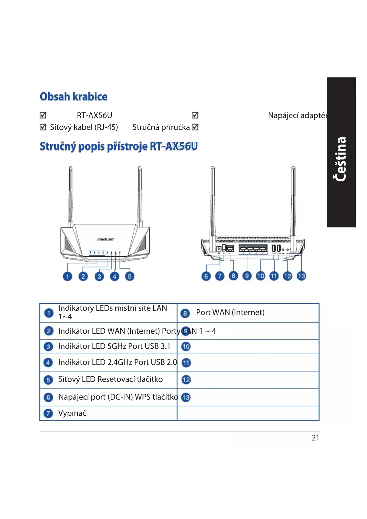 Stručný popis přístroje RT-AX56U Obsah krabice RT-AX56U Napájecí adaptér Síťový kabel (RJ-45) Stručná příručka Indikátory LEDs místní sítě LAN 1~4 Port WAN (Internet) Indikátor LED WAN (Internet) Porty LAN 1 ~ 4 Indikátor LED 5GHz Port USB 3.1 Indikátor LED 2.4GHz Port USB 2.0 Síťový LED Resetovací tlačítko Napájecí port (DC-IN) WPS tlačítko VypínačČeština