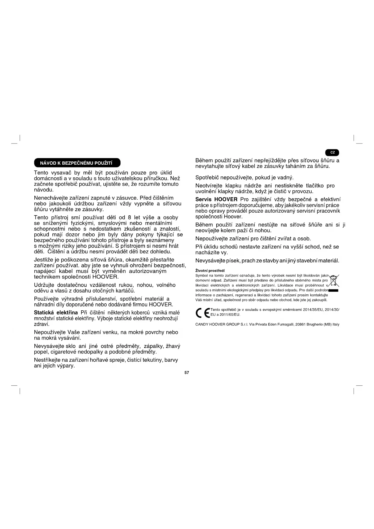 Części zapasowe i materiały eksploatacyjne rmy Hoover Należy zawsze wymieniać części na oryginalne części zapasowe rmy Hoover. Można je nabyć w lokalnym serwisie rmy Hoover lub bezpośrednio w rmie Hoover. Przy zamawianiu części zawsze należy podać numer danego modelu. Serwis rmy Hoover Jeśli potrzebujesz wsparcia serwisowego, części zamiennych lub materiałów eksploata- cyjnych, prosimy o kontakt z regionalnym serwisem Hoover. Jakość Fabryki rmy Hoover zostały poddane niezależnej kontroli pod kątem jakości. Nasze produk- ty zostały wytworzone z wykorzystaniem systemu kontroli jakości spełniającego wymogi normy ISO 9001. Gwarancja Warunki gwarancji na niniejsze urządzenie są określone przez naszego przedstawiciela w kraju, w którym urządzenie jest sprzedawane. Szczegółowe informacje na temat warunków gwarancji można uzyskać w punkcie, w którym urządzenie zostało nabyte. Przy zgłaszaniu wszelkich roszczeń w ramach gwarancji należy przedstawić dowód sprzedaży lub pokwitowanie. Zastrzegamy sobie możliwość wprowadzania zmian bez wcześniejszego powiadomienia.57 NÁVOD K BEZPEČNÉMU POUŽITÍ Tento vysavač by měl být používán pouze pro úklid domácnosti a v souladu s touto uživatelskou příručkou. Než začnete spotřebič používat, ujistěte se, že rozumíte tomuto návodu. Nenechávejte zařízení zapnuté v zásuvce. Před čištěním nebo jakoukoli údržbou zařízení vždy vypněte a síťovou šňůru vytáhněte ze zásuvky. Tento přístroj smí používat děti od 8 let výše a osoby se sníženými fyzickými, smyslovými nebo mentálními schopnostmi nebo s nedostatkem zkušeností a znalostí, pokud mají dozor nebo jim byly dány pokyny týkající se bezpečného používání tohoto přístroje a byly seznámeny s možnými riziky jeho používání. S přístrojem si nesmí hrát děti. Čištění a údržbu nesmí provádět děti bez dohledu. Jestliže je poškozena síťová šňůra, okamžitě přestaňte zařízení používat. aby jste se vyhnuli ohrožení bezpečnosti, napájecí kabel musí být vyměněn autorizovaným technikem společnosti HOOVER. Udržujte dostatečnou vzdálenost rukou, nohou, volného oděvu a vlasů z dosahu otočných kartáčů. Používejte výhradně příslušenství, spotřební materiál a náhradní díly doporučené nebo dodávané rmou HOOVER. Statická elektřina Při čištění některých koberců vzniká malé množství statické elektřiny. Výboje statické elektřiny neohrožují zdraví. Nepoužívejte Vaše zařízení venku, na mokré povrchy nebo na mokrá vysávání. Nevysávejte sklo ani jiné ostré předměty, zápalky, žhavý popel, cigaretové nedopalky a podobné předměty. Nestříkejte na zařízení hořlavé spreje, čistící tekutiny, barvy ani jejich výpary. Během použití zařízení nepřejíždějte přes síťovou šňůru a nevytahujte síťový kabel ze zásuvky taháním za šňůru. Spotřebič nepoužívejte, pokud je vadný. Neotvírejte klapku nádrže ani nestiskněte tlačítko pro uvolnění klapky nádrže, když je čistič v provozu. Servis HOOVER Pro zajištění vždy bezpečné a efektivní práce s přístrojem doporučujeme, aby jakékoliv servisní práce nebo opravy prováděl pouze autorizovaný servisní pracovník společnosti Hoover. Během použití zařízení nestůjte na síťové šňůře ani si ji neovíjejte kolem paží či nohou. Nepoužívejte zařízení pro čištění zvířat a osob. Při úklidu schodů nestavte zařízení na vyšší schod, než se nacházíte vy. Nevysávejte písek, prach ze stavby ani jiný stavební materiál. Životní prostředí Symbol na tomto zařízení označuje, že tento výrobek nesmí být likvidován jako domovní odpad. Zařízení musí být předáno do příslušného sběrného místa pro likvidaci elektrických a elektronických zařízení. Likvidace musí proběhnout v souladu s místními ekologickými předpisy pro likvidaci odpadu. Pro další podrobné informace o zacházení, regeneraci a likvidaci tohoto zařízení prosím kontaktujte Váš místní úřad, společnost pro sběr odpadu nebo obchod, kde jste jej zakoupili. Tento spotřebič je v souladu s evropskými směrnicemi 2014/35/EU, 2014/30/ EU a 2011/65/EU. CANDY HOOVER GROUP S.r.l. Via Privata Eden Fumagalli, 20861 Brugherio (MB) Italy CZ58 A. Pedál Zap/Vyp B. Kryt předmotorového ltru C. Rukojeť nádrže D. Vnitřní tělo nádrže E. Tlačítko pro uvolnění klapky nádrže F. Mechanický detektor plného koše G. Tlačítko k uvolnění zá- padky na konci hadice H. Hadice