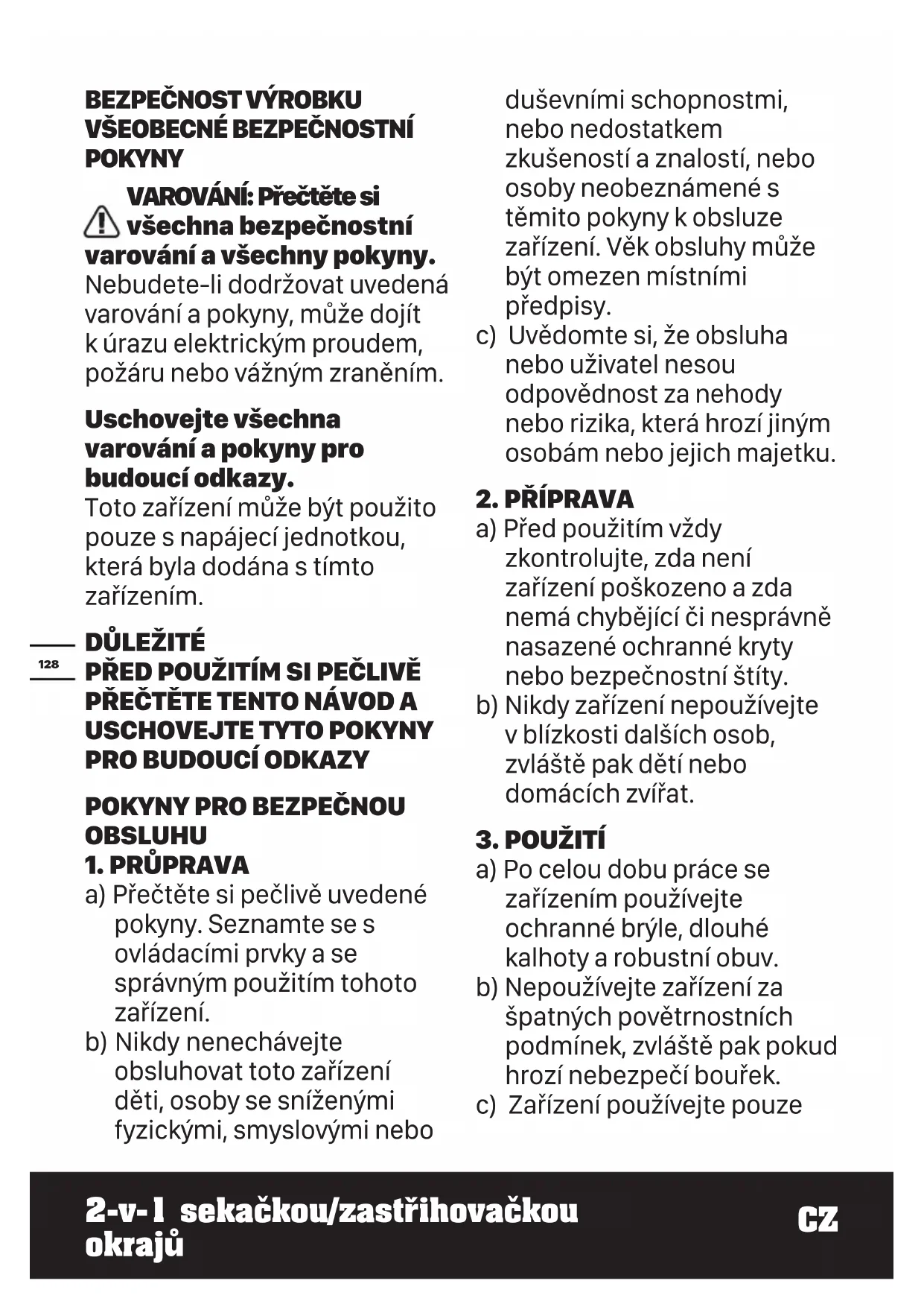 a) Přečtěte si pečlivě uvedené pokyny. Seznamte se s ovládacími prvky a se správným použitím tohoto zařízení. b) Nikdy nenechávejte obsluhovat toto zařízení děti, osoby se sníženými fyzickými, smyslovými nebo duševními schopnostmi, nebo nedostatkem zkušeností a znalostí, nebo osoby neobeznámené s těmito pokyny k obsluze zařízení. Věk obsluhy může být omezen místními předpisy. c) Uvědomte si, že obsluha nebo uživatel nesou odpovědnost za nehody nebo rizika, která hrozí jiným osobám nebo jejich majetku.