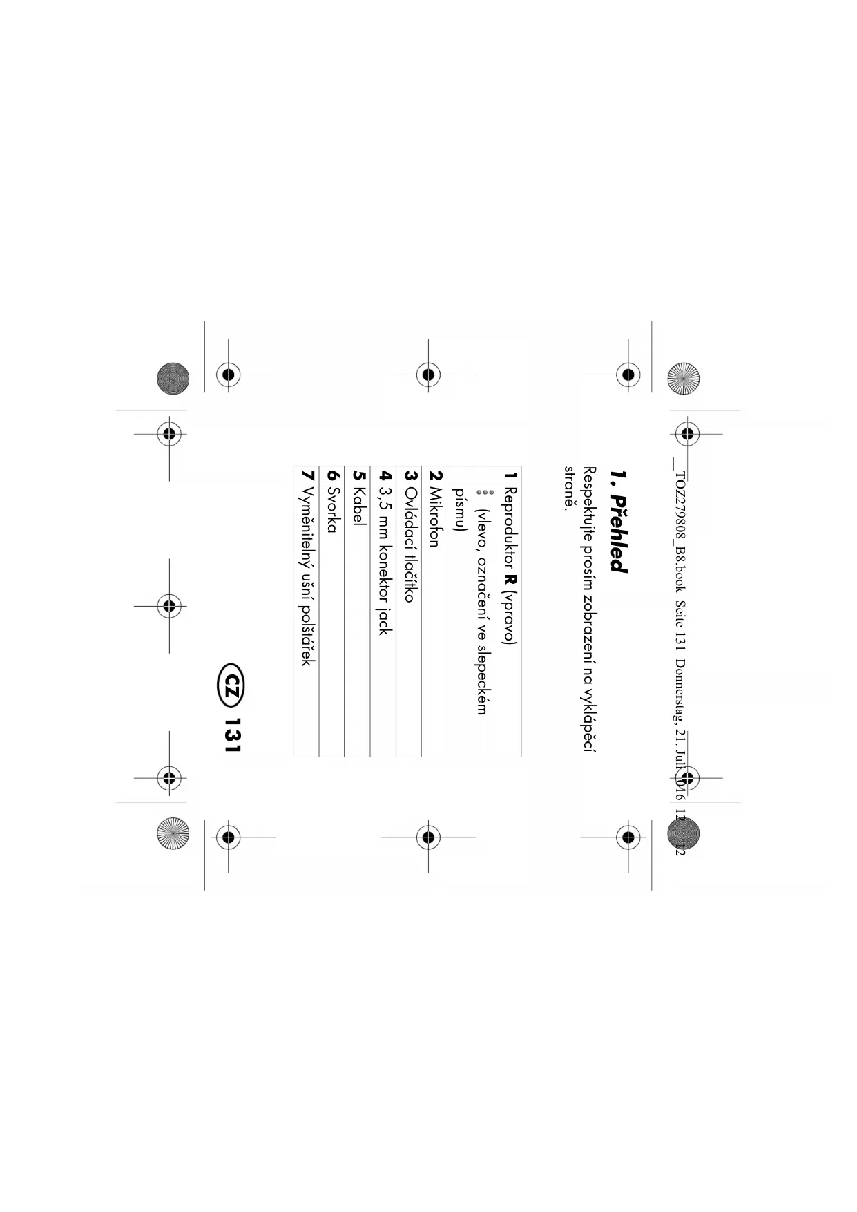 Respektujte prosím zobrazení na vyklápcí stran. 1 Reproduktor R (vpravo) (vlevo, oznaení ve slepeckém písmu) 2 Mikrofon 3 Ovládací tlaítko 4 3,5mm konektor jack 5 Kabel 6 Svorka 7 Vymnitelný ušní polštáek