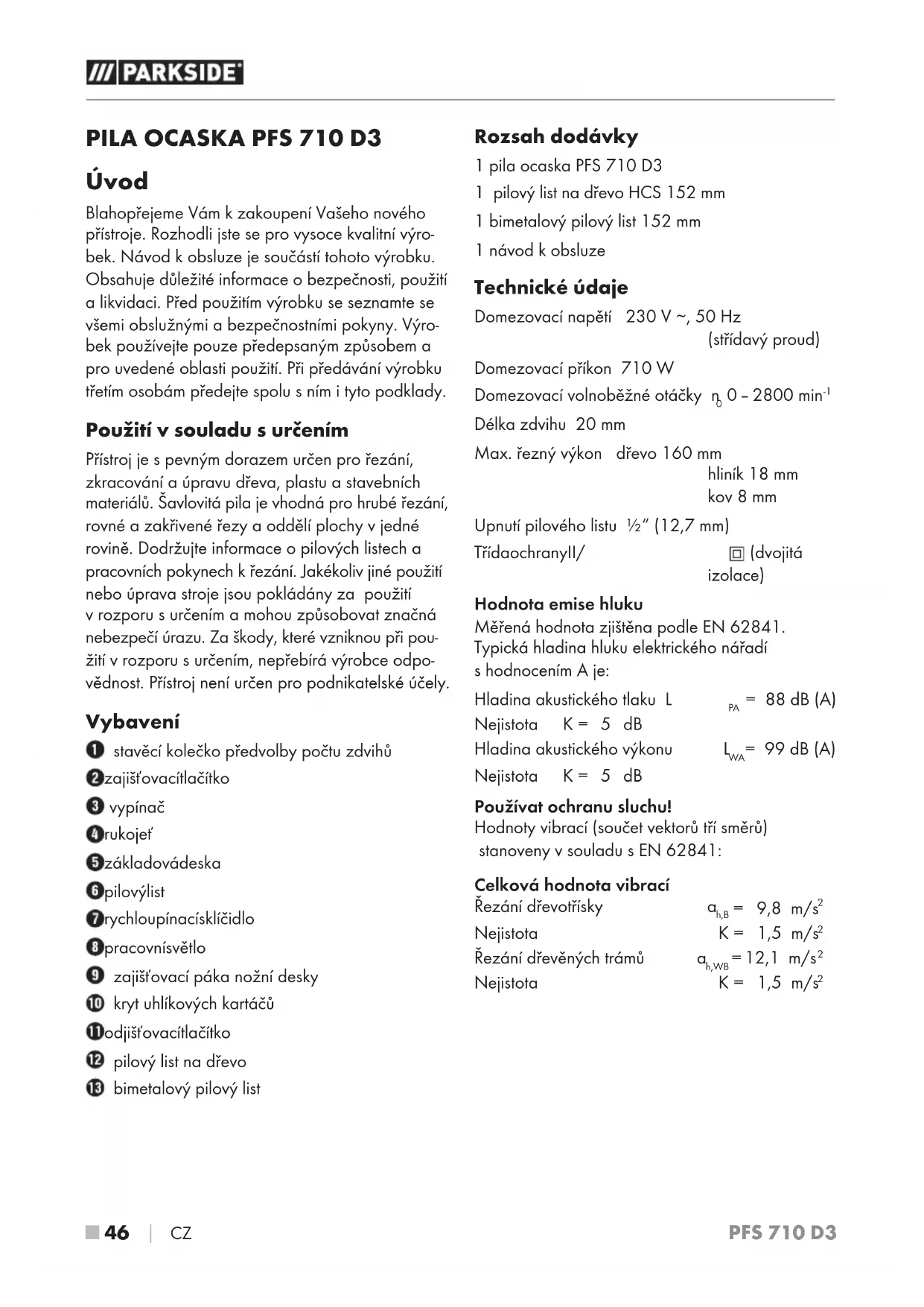 Úvod Blahopřejeme Vám kzakoupení Vašeho nového přístroje. Rozhodli jste se pro vysoce kvalitní výro- bek. Návod kobsluze je součástí tohoto výrobku. Obsahuje důležité informace obezpečnosti, použití a likvidaci. Před použitím výrobku se seznamte se všemi obslužnými a bezpečnostními pokyny. Výro- bek používejte pouze předepsaným způsobem a pro uvedené oblasti použití. Při předávání výrobku třetím osobám předejte spolu sním ityto podklady. Použití vsouladu surčením Přístroj je s pevným dorazem určen pro řezání, zkracování a úpravu dřeva, plastu a stavebních materiálů. Šavlovitá pila je vhodná pro hrubé řezání, rovné a zakřivené řezy a oddělí plochy v jedné rovině. Dodržujte informace o pilových listech a pracovních pokynech k řezání. Jakékoliv jiné použití nebo úprava stroje jsou pokládány za použití vrozporu surčením a mohou způsobovat značná nebezpečí úrazu. Za škody, které vzniknou při pou- žití vrozporu surčením, nepřebírá výrobce odpo- vědnost. Přístroj není určen pro podnikatelské účely. Vybavení stavěcí kolečko předvolby počtu zdvihů zajišťovací tlačítko vypínač rukojeť základová deska pilový list rychloupínací sklíčidlo pracovní světlo zajišťovací páka nožní desky kryt uhlíkových kartáčů odjišťovací tlačítko pilový list na dřevo bimetalový pilový list Rozsah dodávky 1 pila ocaska PFS 710 D3 1 pilový list na dřevo HCS 152 mm 1 bimetalový pilový list 152 mm 1 návod kobsluze Technické údaje Domezovací napětí 230 V ∼, 50 Hz (střídavý proud) Domezovací příkon 710 W Domezovací volnoběžné otáčky n