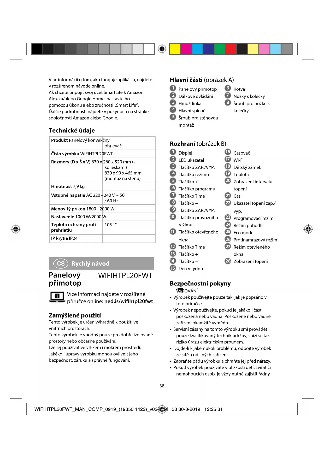 4. V aplikaci Nedis SmartLife klepněte na +.5. Vyberte ze seznamu typ zařízení, které chcete přidat.6. Ujistěte se, že LED ukazatel B rychle bliká, popř. podržením tlačítka + B na dobu 5sekund přístroj resetujte.7. Řiďte se pokyny uvedenými v aplikaci Nedis SmartLife. Ujistěte se, že je výrobek připojený k 2,4 GHz síti Wi-Fi.8. Po přidání výrobku jej lze přejmenovat a přiřadit k místnosti. Po potvrzení lze přístroj ovládat pomocí chytrého telefonu.Více informací o tom, jak aplikace funguje, najdete v rozšířené příručce online.Chcete-li připojit svůj účet SmartLife ke službě Amazon Alexa a/nebo Google Home, nastavte spojení pomocí akce či dovednosti „Smart Life“. Více informací najdete v pokynech od Amazonu či Googlu. Technické údaje Produkt Panelový přímotopČíslo položky WIFIHTPL20FWTRozměry (D × Š × V) 830 × 260 × 520 mm (s kolečky)830 × 90 × 465 mm (montovaný na stěnu)Hmotnost 7,9kgVstupní napětí AC 220 - 240 V ~ 50 / 60 HzJmenovitý příkon 1800 - 2000 WNastavení 1000 W / 2000 WTeplota ochrany proti přehřátí105 °CStupeň ochrany IP24