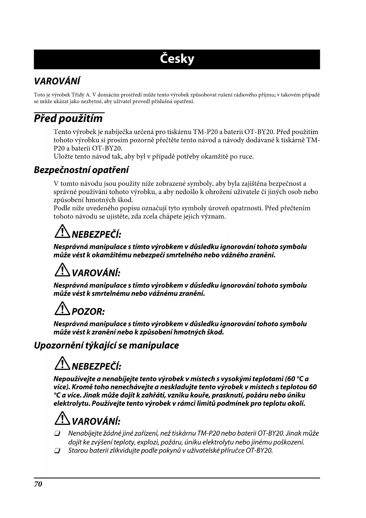ktighet Under drift 0 till 40 °C, 10 till 90 % relativ luftfuktighet Under förvaring Hög temperatur och fuktighet: 50°C, 90 % relativ luftfuktighet under 120 timmar Hög temperatur: 70°C under 120 timmar Låg temperatur: -25°C under 120 timmar Yttermått (B × D × H) 110 × 133 × 64 mm Vikt Ca. 0,3 kg70 Česky VAROVÁNÍ Toto je výrobek Třídy A. V domácím prostředí může tento výrobek způsobovat rušení rádiového příjmu; v takovém případě se může ukázat jako nezbytné, aby uživatel provedl příslušná opatření. Před použitím Tento výrobek je nabíječka určená pro tiskárnu TM-P20 a baterii OT-BY20. Před použitím tohoto výrobku si prosím pozorně přečtěte tento návod a návody dodávané k tiskárně TM- P20 a baterii OT-BY20. Uložte tento návod tak, aby byl v případě potřeby okamžitě po ruce. Bezpečnostní opatření V tomto návodu jsou použity níže zobrazené symboly, aby byla zajištěna bezpečnost a správné používání tohoto výrobku, a aby nedošlo k ohrožení uživatele či jiných osob nebo způsobení hmotných škod. Podle níže uvedeného popisu označují tyto symboly úroveň opatrnosti. Před přečtením ohoto návodu se ujistěte, zda zcela chápete jejich význam. !NEBEZPEČÍ: Nesprávná manipulace s tímto výrobkem v důsledku ignorování tohoto symbolu může vést k okamžitému nebezpečí smrtelného nebo vážného zranění. !VAROVÁNÍ: Nesprávná manipulace s tímto výrobkem v důsledku ignorování tohoto symbolu může vést k smrtelnému nebo vážnému zranění. !POZOR: Nesprávná manipulace s tímto výrobkem v důsledku ignorování tohoto symbolu může vést k zranění nebo k způsobení hmotných škod. Upozornění týkající se manipulace !NEBEZPEČÍ: Nepoužívejte a nenabíjejte tento výrobek v místech s vysokými teplotami (60 °C a více). Kromě toho nenechávejte a neskladujte tento výrobek v místech s teplotou 60 °C a více. Jinak může dojít k zahřátí, vzniku kouře, prasknutí, požáru nebo úniku elektrolytu. Používejte tento výrobek v rámci limitů podmínek pro teplotu okolí. !VAROVÁNÍ:
