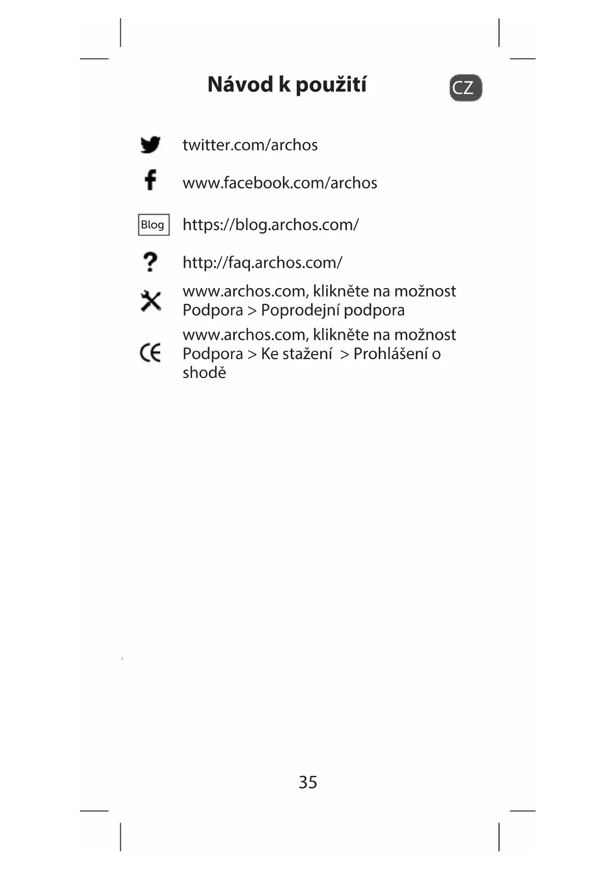 Návod k použití twitter.com/archos www.facebook.com/archos Blog https://blog.archos.com/ http://faq.archos.com/ www.archos.com, klikněte na možnost Podpora > Poprodejní podpora www.archos.com, klikněte na možnost Podpora > Ke stažení > Prohlášení o shodě36
