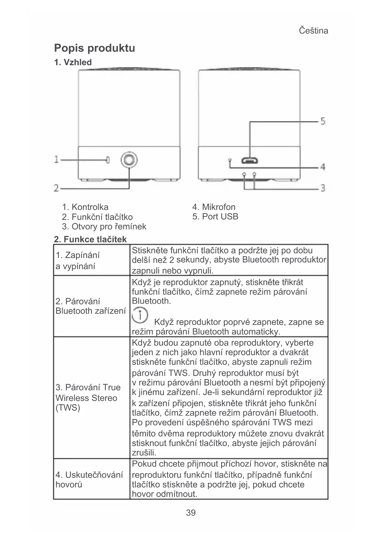 Nabíjení (Reproduktor je zapnutý) Trvale svítí červeně po dobu 5 sekund a potom se vrátí do předchozího stavu indikace Trvale svítí nebo bliká modře, pokud je úroveň nabití baterie nízká Volání Bliká modře při příchozím hovoru a trvale svítí modře během hovoru Přehrávání hudby Trvale svítí modře Režim párování TWS Bliká střídavě červeně a modře na hlavním reproduktoru a na sekundárním reproduktoru bliká modře Režim připojení TWS Trvale svítí nebo bliká modře na hlavním reproduktoru a na sekundárním reproduktor bliká modřeČeština