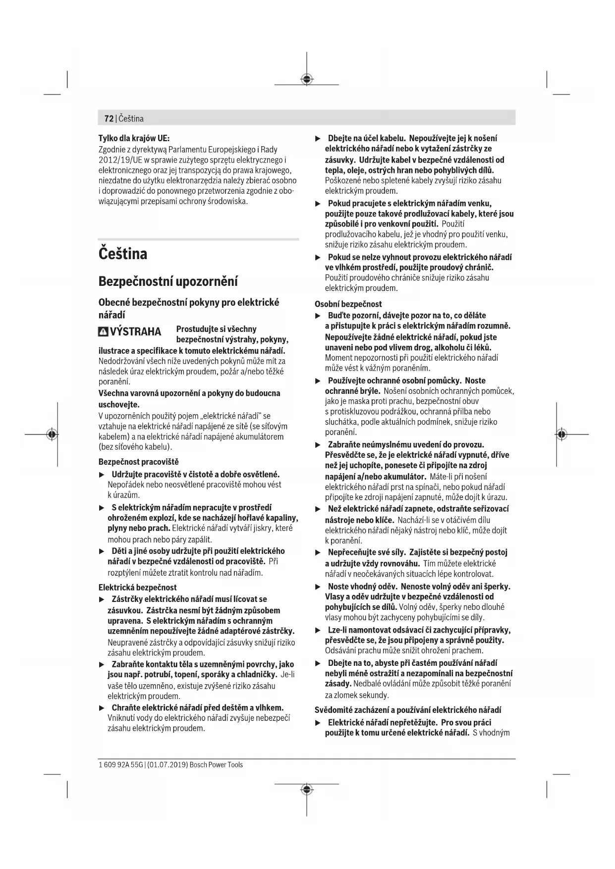 Úroveň vibrací aúroveň hluku, které jsou uvedené vtěchto pokynech, byly změřeny pomocí normované měřicí metody alze je použít pro vzájemné porovnání elektronářadí. Hodí se ipro předběžný odhad zatížení vibracemi ahlukem. Uvedená úroveň vibrací aúroveň hluku reprezentuje hlavní použití elektronářadí. Pokud se ovšem bude elektronářadí používat pro jiné práce, sjinými nástroji nebo snedostatečnou údržbou, může se úroveň hluku aúroveň vibrací lišit. To může zatížení vibracemi ahlukem po celou pracovní dobu zřetelně zvýšit. Pro přesný odhad zatížení vibracemi ahlukem by měly být zohledněny idoby, kdy je nářadí vypnuté nebo běží, ale ve skutečnosti se nepoužívá. To může zatížení vibracemi ahlukem po celou pracovní dobu výrazně snížit. Stanovte dodatečná bezpečnostní opatření kochraně obsluhy před účinky vibrací, jako je např. údržba elektronářadí anástrojů, udržování teplých rukou, organizace pracovních procesů. Montáž u Před každou prací na elektronářadí vytáhněte zástrčku ze zásuvky. Přídavná rukojeť (viz obrázek A) u Elektrické nářadí používejte pouze spřídavnou rukojetí (8). Křídlový šroub (7) otočte proti směru hodinových ručiček apřídavnou rukojeť (8) nasaďte vpožadované poloze přes vrtací sklíčidlo na krk vřetena elektronářadí. Přídavnou rukojeť (8) můžete otočit, aby bylo zajištěno bezpečné apohodlné držení při práci. Přídavnou rukojeť (8) otočte do požadované polohy ašroub skřídlovou hlavou (7) utáhněte ve směru hodinových ručiček. u Před každou prací se přesvědčte, že je křídlový šroub pevně utažený. Ztráta kontroly může způsobit poranění. Nastavení hloubky vrtání Pomocí hloubkového dorazu (9) lze nastavit požadovanou hloubku vrtáníX. Povolte křídlový šroub pro nastavení hloubkového dorazu (6) anasaďte hloubkový doraz do přídavné rukojeti (8). Rýhování na hloubkovém dorazu (9) musí směřovat nahoru. Hloubkový doraz utáhněte natolik, aby vzdálenost mezi špičkou vrtáku ašpičkou hloubkového dorazu odpovídala požadované hloubce vrtáníX. Znovu utáhněte křídlový šroub pro nastavení hloubkového dorazu (6). Výměna nástroje u Při výměně nástroje noste ochranné rukavice. Sklíčidlo se může při delší práci silně zahřát. 1 609 92A 55G | (01.07.2019) Bosch Power ToolsČeština | 75 Ozubené sklíčidlo (viz obrázek B) Otáčením otevřete ozubené sklíčidlo (1) tak, aby bylo možné nasadit nástroj. Nasaďte nástroj. Nasaďte kličku sklíčidla (11) do příslušných otvorů vozubeném sklíčidle (1) anástroj stejnoměrně upněte. Šroubovací nástroje (viz obrázek C) Při použití šroubovacích bitů (12) byste měli vždy používat univerzální držák bitů (13). Použijte pouze šroubovací bity odpovídající hlavě šroubu. Při šroubování nastavte přepínač „vrtání/ vrtání spříklepem“ (2) vždy na symbol „vrtání“. Výměna sklíčidla Uelektrického nářadí bez aretace vrtacího vřetene musí být sklíčidlo vyměněno autorizovaným servisem pro elektrické nářadí Bosch. Sklíčidlo se musí utáhnout utahovacím momentem cca 30–35Nm. Odsávání prachu/třísek Prach zmateriálů, jako jsou nátěry sobsahem olova, některé druhy dřeva, minerály akov, může být zdraví škodlivý. Kontakt sprachem či vdechnutí mohou vyvolat alergické reakce a/nebo onemocnění dýchacích cest obsluhy nebo vblízkosti se nacházejících osob. Určitý prach, jako dubový nebo bukový prach, je pokládán za karcinogenní, zvláště ve spojení spřídavnými látkami pro ošetření dřeva (chromát, ochranné prostředky na dřevo). Materiál obsahující azbest smějí opracovávat pouze specialisté. – Zajistěte dobré větrání pracoviště. – Je doporučeno nosit ochrannou dýchací masku střídou filtruP2. Dodržujte předpisy pro obráběné materiály platné vpříslušné zemi. u Zabraňte hromadění prachu na pracovišti. Prach se může lehce vznítit. Provoz Uvedení do provozu u Dbejte na správné síťové napětí! Napětí zdroje proudu musí souhlasit súdaji na typovém štítku elektronářadí. Elektronářadí označené 230V smí být provozováno ina 220V. Nastavení směru otáčení (viz obrázek D – E) u Přepínač směru otáčení(5) používejte pouze tehdy, když je elektronářadí zastavené. Pomocí přepínače směru otáčení (5) můžete změnit směr otáčení elektronářadí. Při stisknutém vypínači (4) to ale není možné. Chod vpravo: Pro vrtání azašroubování šroubů stiskněte přepínač směru otáčení (5) až nadoraz doleva. Chod vlevo: Pro povolování, resp. vyšroubování šroubů amatic stiskněte přepínač směru otáčení (5) až na doraz doprava. Nastavení druhu provozu Vrtání ašroubování Nastavte přepínač (2) na symbol „vrtání“. Vrtání spříklepem Nastavte přepínač (2) na symbol „vrtání spříklepem“. Přepínač (2) citelně zaskočí alze ho ovládat ipři běžícím motoru. Zapnutí avypnutí Pro zapnutí elektronářadí stiskněte vypínač (4) adržte ho stisknutý. Pro zajištění stisknutého vypínače (4) stiskněte aretační tlačítko(3). Pro vypnutí elektrického nářadí uvolněte vypínač (4), resp. pokud je zaaretovaný aretačním tlačítkem (3), krátce stiskněte vypínač (4) apak ho uvolněte. Nastavení otáček/příklepů Otáčky/příklepy zapnutého elektrického nářadí můžete plynule regulovat tím, jak moc stisknete vypínač (4). Mírným stisknutím vypínače (4) dosáhnete nízkých otáček/ příklepů. Spřibývajícím tlakem se otáčky/příklepy zvyšují. Pracovní pokyny u Před každou prací na elektronářadí vytáhněte zástrčku ze zásuvky. u Elektronářadí nasazujte na matici/šroub