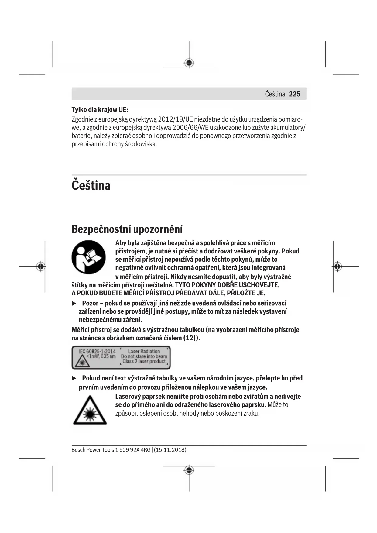 Baterie 2× 1,5V LR03 (AAA)Digitální laserový dálkoměr GLM 500 Akumulátorové články 2× 1,2 VHR03 (AAA) A) Při měření od přední hrany měřicího přístroje, platí pro vysokou odrazivost cíle (např. na bílo natřená zeď), slabé osvětlení pozadí aprovozní teplotu 25°C. Navíc je potřeba počítat sodchylkou ± 0,05mm/m. B) Při měření od zadní hrany měřicího přístroje platí pro nízkou odrazivost cíle (např. tmavě natřená zeď) silné osvětlení pozadí aprovozní teplotu −10°C až +45°C. Navíc je potřeba počítat sodchylkou ±0,15mm/m. C) Po kalibraci uživatelem při 0° a90°; musí se zohlednit navíc chyba stoupání ±0,01°/ stupně až 45° (max.). Jako referenční rovina pro měření sklonu slouží levá strana měřicího přístroje. D) Při provozní teplotě 25°C. E) Jako referenční rovina pro měření sklonů slouží levá strana měřicího přístroje. F) Ve funkci trvalého měření je max. provozní teplota +40°C. G) Vyskytuje se pouze nevodivé znečištění, přičemž příležitostně se ale očekává dočasná vodivost způsobená orosením. H) Svýjimkou přihrádky pro baterie Kjednoznačné identifikaci měřicího přístroje slouží sériové číslo (11) na typovém štítku. Montáž Vložení/výměna baterií Pro provoz měřicího přístroje doporučujeme použít alkalicko-manganové baterie nebo akumulátory. S1,2V akumulátory může být případně možný menší počet měření než s1,5V bateriemi. Pro otevření krytu přihrádky pro baterie (9) stiskněte aretaci (10) akryt přihrádky pro baterie sejměte. Vložte baterie, resp. akumulátory. Přitom dodržujte správnou polaritu podle vyobrazení na vnitřní straně přihrádky pro baterie. Když se na displeji poprvé objeví symbol vybité baterie, je možné provést ještě cca 100měření. Když je symbol baterie prázdný ačerveně bliká, nejsou již možná žádná měření. Vyměňte baterie nebo akumulátory. Vyměňte vždy všechny baterie, resp. akumulátory současně. Použijte pouze baterie nebo akumulátory jednoho výrobce astejné kapacity. u Když měřicí přístroj delší dobu nepoužíváte, vyjměte zněj baterie, resp. akumulátory. Baterie aakumulátory mohou pří delším skladování korodovat asamy se vybít. Čeština | 229 Bosch Power Tools 1 609 92A 4RG | (15.11.2018)230 | Čeština 1 609 92A 4RG | (15.11.2018) Bosch Power Tools Provoz Uvedení do provozu u Nenechávejte zapnutý měřicí přístroj bez dozoru apo použití ho vypněte. Mohlo by dojít koslnění jiných osob laserovým paprskem. u Chraňte měřicí přístroj před vlhkem apřímým slunečním zářením. u Nevystavujte měřicí přístroj extrémním teplotám nebo kolísání teplot. Nenechávejte ho např. delší dobu ležet vautě. Při větším kolísání teplot nechte měřicí přístroj nejprve vytemperovat, než ho uvedete do provozu. Při extrémních teplotách nebo teplotních výkyvech může být omezena přesnost přístroje. u Chraňte měřicí přístroj před prudkými nárazy nebo pádem. Pokud byl měřicí přístroj vystavený působení silných vnějších vlivů, měli byste před další prací provést kontrolu přesnosti (viz „Kontrola přesnosti akalibrace měření sklonu (viz obrázkyE1– E2)“, Stránka237). Zapnutí avypnutí – Pro zapnutí měřicího přístroje alaseru krátce stiskněte tlačítko měření (2) [ ]. – Pro zapnutí měřicího přístroje bez laseru krátce stiskněte tlačítko zapnutí/vypnutí (5)