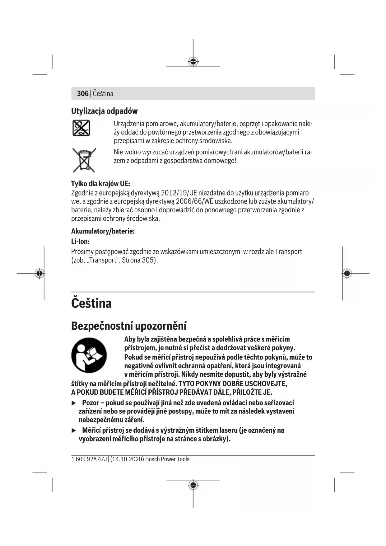 Provozní frekvenční pásmo 2402–2480 MHz 2402–2480 MHz Max. vysílací výkon 8 mW 8 mW A) Při měření od přední hrany měřicího přístroje, platí pro vysokou odrazivost cíle (např. na bílo natřená zeď), slabé osvětlení pozadí aprovozní teplotu 25°C. Navíc je potřeba počítat sodchylkou vzávislosti na vzdálenosti ±0,05mm/m. B) Při měření od přední hrany měřicího přístroje, platí pro vysokou odrazivost cíle (např. na bílo natřená zeď), silné osvětlení pozadí aprovozní teplotu 25°C. Navíc je potřeba počítat sodchylkou vzávislosti na vzdálenosti ±0,15mm/m. C) Po kalibraci uživatelem při 0° a90°; musí se zohlednit navíc chyba stoupání ±0,01°/stupně až 45° (max.). Jako referenční rovina pro měření sklonu slouží levá strana měřicího přístroje. D) Při provozní teplotě 25°C. E) Ve funkci trvalého měření je max. provozní teplota +40°C. F) Vyskytuje se pouze nevodivé znečištění, přičemž příležitostně se ale očekává dočasná vodivost způsobená orosením. G) Bluetooth® deaktivované H) Upřístrojů sBluetooth® nemusí být vzávislosti na modelu aoperačním systému možné navázat spojení. Přístroje Bluetooth® musí podporovat profil GATT. Kjednoznačné identifikaci měřicího přístroje slouží sériové číslo(11) na typovém štítku. 1 609 92A 4ZJ | (14.10.2020) Bosch Power ToolsČeština | 313 Rozhraní Bluetooth® Přenos dat do jiných zařízení Měřicí přístroj je vybavený modulem Bluetooth®, který pomocí rádiové techniky umožňuje přenos dat na určitá mobilní koncová zařízení srozhraním Bluetooth® (např. chytrý telefon, tablet). Informace opotřebných systémových předpokladech pro spojení přes Bluetooth® najdete na internetových stránkách www.bosch-pt.com. u Další informace najdete na produktových stránkách Bosch. Při přenosu dat přes Bluetooth® může mezi mobilním koncovým zařízením aměřicím přístrojem docházet kčasové prodlevě. Může to být způsobené vzdáleností obou zařízení nebo měřeným objektem. Aktivace rozhraní Bluetooth® pro přenos dat do mobilního koncového zařízení Zkontrolujte, zda je na vašem mobilním koncovém zařízení aktivované rozhraní Bluetooth®. Stiskněte tlačítko(1), abyste si vyvolali nabídku Bluetooth®, aznovu stiskněte tlačítko(1) (nebo tlačítko (6) [+]) pro aktivaci rozhraní Bluetooth®. Pokud je nalezeno více aktivních měřicích přístrojů, vyberte správný měřicí přístroj podle sériového čísla. Sériové číslo(11) najdete na typovém štítku měřicího přístroje. Stav spojení aaktivní spojení(b) je zobrazené na stavové liště(h) měřicího přístroje. Pro rozšíření rozsahu funkcí jsou kdispozici aplikace Bosch. Můžete si je vzávislosti na koncovém zařízení stáhnout vpříslušných obchodech saplikacemi. Deaktivace rozhraní Bluetooth® Stiskněte tlačítko(1), abyste si vyvolali nabídku Bluetooth®, aznovu stiskněte tlačítko(1) (nebo tlačítko (3) [–]) pro deaktivaci rozhraní Bluetooth®. Montáž Vložení/výměna baterií Pro provoz měřicího přístroje doporučujeme používat alkalicko-manganové baterie nebo nikl-metal-hydridové akumulátory (zejména při nízkých provozních teplotách). S1,2V akumulátory může být vzávislosti na kapacitě případně možný větší počet měření než s1,5V bateriemi. Pro otevření krytu přihrádky pro baterie(13) stiskněte aretaci(12) akryt přihrádky pro baterie sejměte. Vložte baterie, resp. akumulátory. Přitom dodržujte správnou polaritu podle vyobrazení na vnitřní straně přihrádky baterie. Bosch Power Tools 1 609 92A 4ZJ | (14.10.2020)314 | Čeština Při nízkém stavu nabití baterií, resp. akumulátorů se na displeji zobrazí dotaz ohledně aktivace režimu úspory baterií. Při aktivovaném režimu úspory baterií se prodlužuje doba chodu baterií asymbol baterie na displeji je ve žlutém rámečku(viz „Nabídka „Nastavení“ (viz obrázek C)“, Stránka316). Když se poprvé na displeji zobrazí symbol prázdné baterie, je pak už možný jen malý počet měření. Když je symbol baterie prázdný ačerveně bliká, nejsou již možná žádná měření. Vyměňte baterie nebo akumulátory. Vyměňte vždy všechny baterie, resp. akumulátory současně. Použijte pouze baterie nebo akumulátory jednoho výrobce astejné kapacity. u Když měřicí přístroj delší dobu nepoužíváte, vyjměte zněj baterie, resp. akumulátory. Baterie aakumulátory mohou pří delším skladování korodovat asamy se vybít. Nasazení/výměna lithium-iontového akumulátoru (příslušenství) Nasaďte lithium-iontový akumulátor (24) (viz obrázek A). Pro vyjmutí lithium-iontového akumulátoru (24) stiskněte aretaci (25) alithium-iontový akumulátor vyjměte. Provoz Nabíjení lithium-iontového akumulátoru (příslušenství) Upozornění: Akumulátor se dodává částečně nabitý. Aby byl zaručen plný výkon akumulátoru, před prvním použitím akumulátor úplně nabijte. USB zdířka pro připojení USB kabelu (26) akontrolka nabíjení se nacházejí pod krytem USB zdířky (27) na lithium-iontovém akumulátoru (24) (příslušenství). Otevřete kryt USB zdířky (27) azapojte USB kabel (26). Během nabíjení se může ukazatel baterie na displeji lišit od skutečného stavu nabití lithium-iontového akumulátoru (24). Když je lithium-iontový akumulátor (24) úplně nabitý, svítí kontrolka nabíjení zeleně. Během nabíjení svítí kontrolka nabíjení žlutě. Červená kontrolka nabíjení signalizuje, že jsou nabíjecí napětí nebo nabíjecí proud nevhodné. Uvedení do provozu u Nenechávejte zapnutý měřicí přístroj bez dozoru apo použití ho vypněte. Mohlo by dojít koslnění jiných osob laserovým paprskem. u Chraňte měřicí přístroj před vlhke