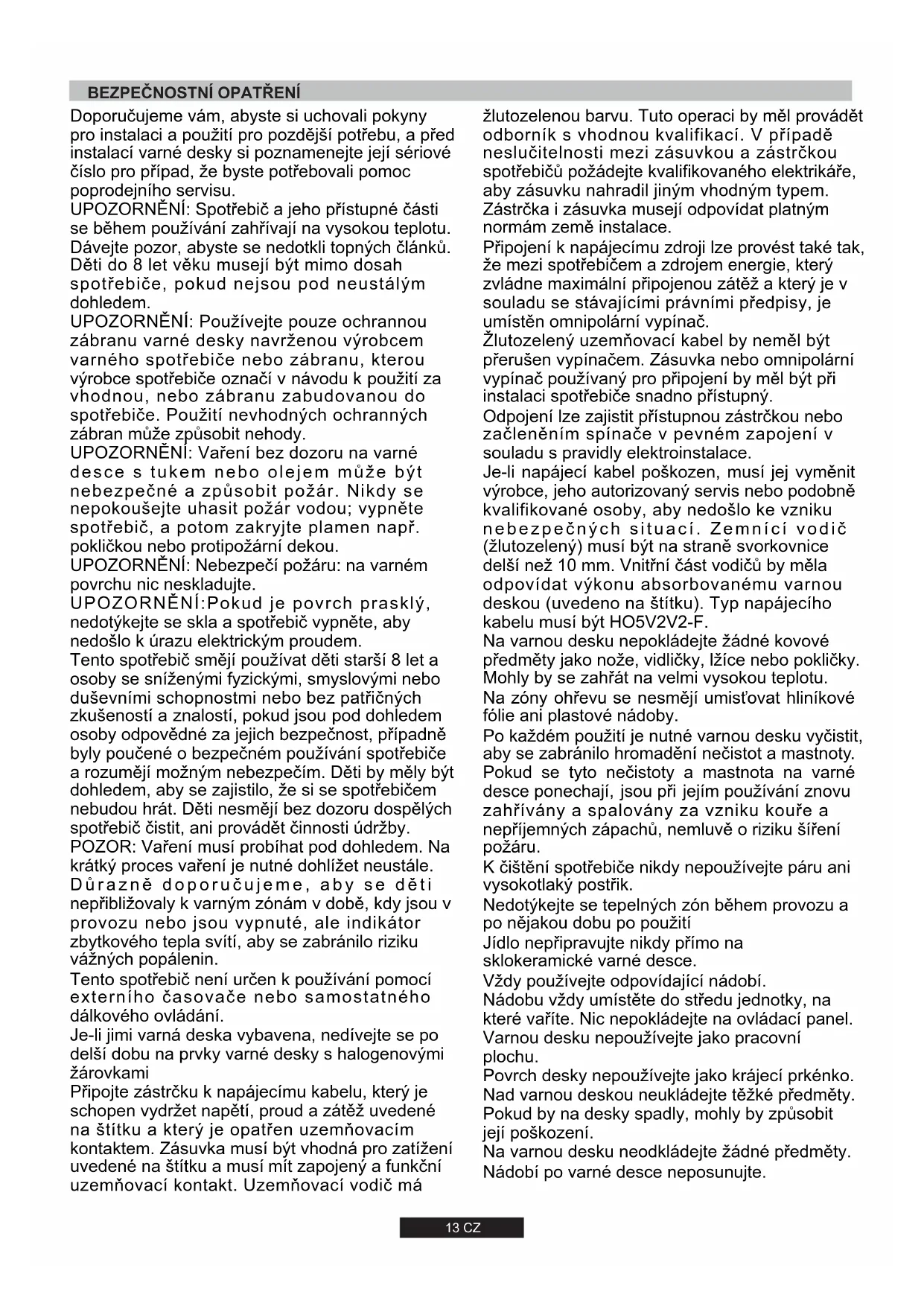 12 FR Table 1 Cet appareil a été dessiné pour un usage non professionnel, usage domestique uniquement Plaque de brûleur Brûleur Type FFD Aux 1kW Sr 1,75 kW R 2,7 kW Dc 4 kW Mono Entrée de chaleur nominale G20/20 mbar G30/28-30 mbar Classe d'installation Voltage / Frequency V / Hz Puissance électrique Allumage électronique intégré Dimensions appareil (LxP) mm UR 3,5 kW13 CZ Doporučujeme vám, abyste si uchovali pokyny pro instalaci a použití pro pozdější potřebu, a před instalací varné desky si poznamenejte její sériové číslo pro případ, že byste potřebovali pomoc poprodejního servisu. UPOZORNĚNÍ: Spotřebič a jeho přístupné části se během používání zahřívají na vysokou teplotu. Dávejte pozor, abyste se nedotkli topných článků. Děti do 8 let věku musejí být mimo dosah spotřebiče, pokud nejsou pod neustálým dohledem. UPOZORNĚNÍ: Používejte pouze ochrannou zábranu varné desky navrženou výrobcem varného spotřebiče nebo zábranu, kterou výrobce spotřebiče označí v návodu k použití za vhodnou, nebo zábranu zabudovanou do spotřebiče. Použití nevhodných ochranných zábran může způsobit nehody. UPOZORNĚNÍ: Vaření bez dozoru na varné desce s tukem nebo olejem může být nebezpečné a způsobit požár. Nikdy se nepokoušejte uhasit požár vodou; vypněte spotřebič, a potom zakryjte plamen např. pokličkou nebo protipožární dekou. UPOZORNĚNÍ: Nebezpečí požáru: na varném povrchu nic neskladujte. UPOZORNĚNÍ:Pokud je povrch prasklý, nedotýkejte se skla a spotřebič vypněte, aby nedošlo k úrazu elektrickým proudem. Tento spotřebič smějí používat děti starší 8 let a osoby se sníženými fyzickými, smyslovými nebo duševními schopnostmi nebo bez patřičných zkušeností a znalostí, pokud jsou pod dohledem osoby odpovědné za jejich bezpečnost, případně byly poučené o bezpečném používání spotřebiče a rozumějí možným nebezpečím. Děti by měly být dohledem, aby se zajistilo, že si se spotřebičem nebudou hrát. Děti nesmějí bez dozoru dospělých spotřebič čistit, ani provádět činnosti údržby. POZOR: Vaření musí probíhat pod dohledem. Na krátký proces vaření je nutné dohlížet neustále. Důrazně doporučujeme, aby se děti nepřibližovaly k varným zónám v době, kdy jsou v provozu nebo jsou vypnuté, ale indikátor zbytkového tepla svítí, aby se zabránilo riziku vážných popálenin. Tento spotřebič není určen k používání pomocí externího časovače nebo samostatného dálkového ovládání. Je-li jimi varná deska vybavena, nedívejte se po delší dobu na prvky varné desky s halogenovými žárovkami Připojte zástrčku k napájecímu kabelu, který je schopen vydržet napětí, proud a zátěž uvedené na štítku a který je opatřen uzemňovacím kontaktem. Zásuvka musí být vhodná pro zatížení uvedené na štítku a musí mít zapojený a funkční uzemňovací kontakt. Uzemňovací vodič má