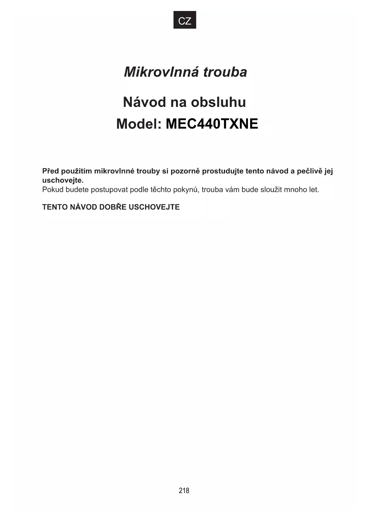 217Mikrovlnná trouba Návod na obsluhu Před použitím mikrovlnné trouby si pozorně prostudujte tento návod a pečlivě jej uschovejte. Pokud budete postupovat podle těchto pokynů, trouba vám bude sloužit mnoho let.