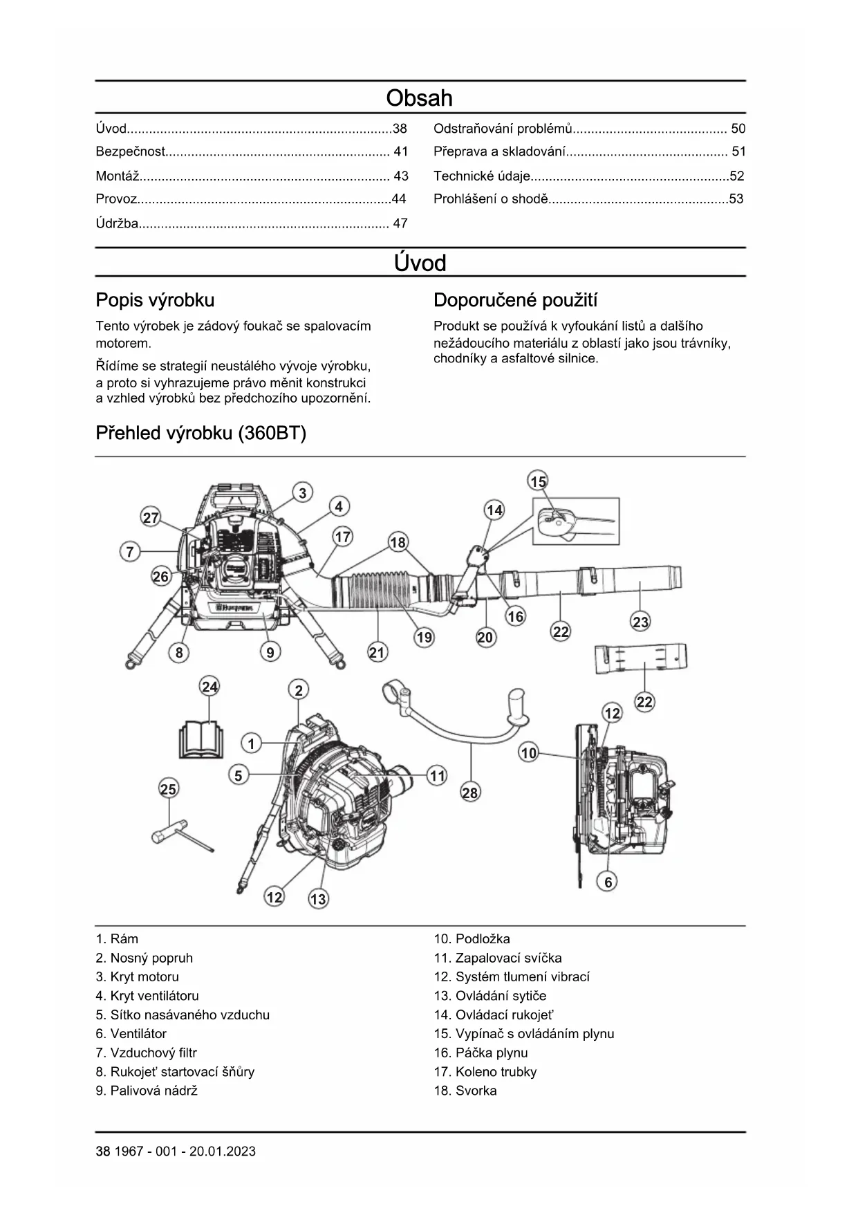 - Prohlášení oshodě Úvod Popis výrobku Tento výrobek je zádový foukač se spalovacím motorem. Řídíme se strategií neustálého vývoje výrobku, aproto si vyhrazujeme právo měnit konstrukci avzhled výrobků bez předchozího upozornění. Doporučené použití Produkt se používá kvyfoukání listů a dalšího nežádoucího materiálu zoblastí jako jsou trávníky, chodníky aasfaltové silnice. Přehled výrobku (360BT) p. 53