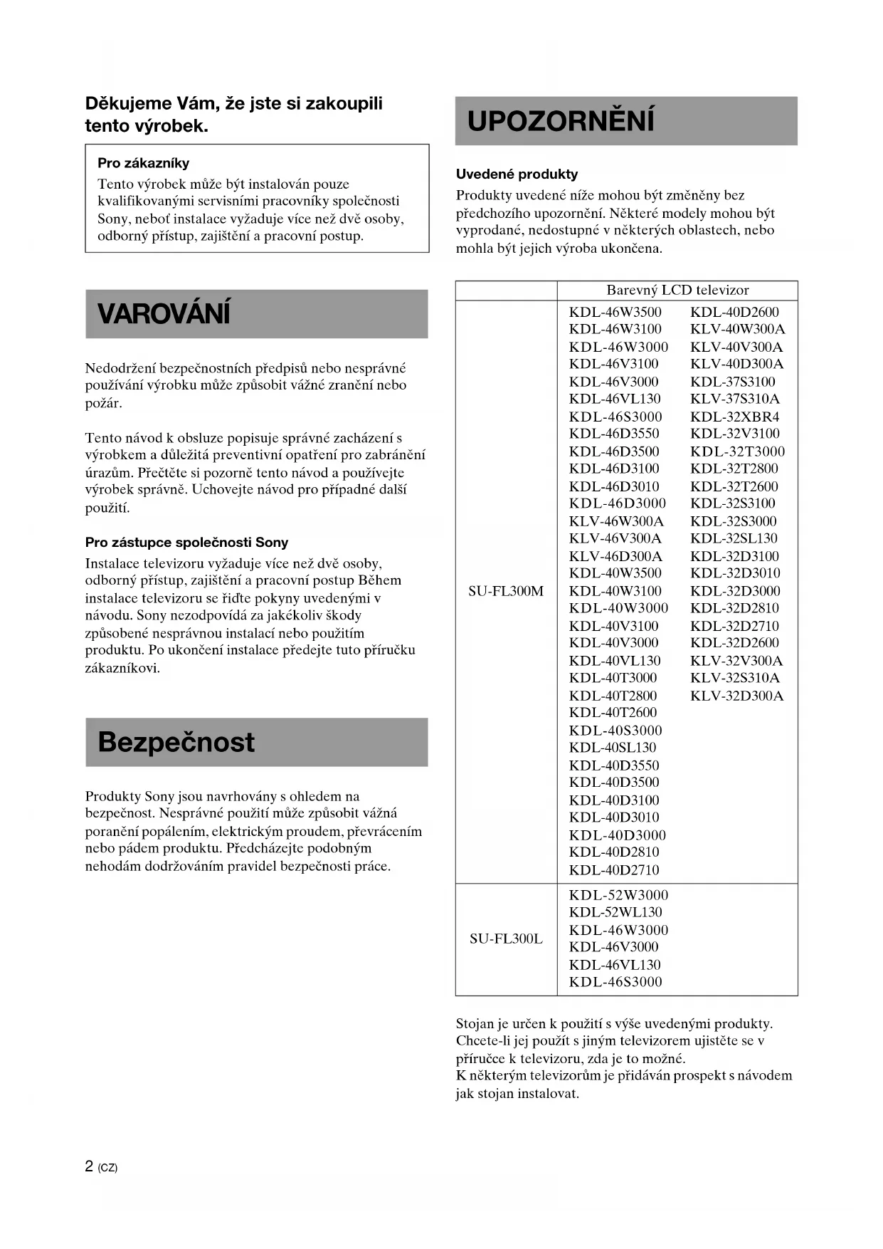 SU-FL300L KDL-52W3000 KDL-52WL130 KDL-46W3000 KDL-46V3000 KDL-46VL130 KDL-46S30003 (CZ) Instalaci produktu smí provádět pouze kvalifikovaní zaměstnanci firmy Sony. Televizor a stojan jsou velmi těžké. Instalace prováděná nekvalifikovanými osobami může mít za následek vážná poranění. Ujistěte se, že jste učinili nezbytná opatření k zamezení převrácení stojanu. Neučiníte-li tak, může dojít k převrácení televizoru a způsobení zranění. Připevněte televizor ke zdi, sloupu, apod. pro zamezení převrácení. Ujistěte se, že je stojan umístěn na pevném a rovném povrchu. Neinstalujte stojan na nerovném povrchu. Učiníte-li tak, může dojít k převrácení stojanu nebo k pádu televizoru. Může dojít ke zranění nebo způsobení škody. Před instalací na měkkém povrchu (koberci, rohoži apod.) umístěte na určené místo pevnou desku. Nepoužívejte stojan, pokud je poškozený. O televizor se neopírejte a nezavěšujte se na něj. Může dojít k převrácení stojanu, pádu televizoru a způsobení vážných zranění nebo úmrtí. Zabraňte dětem v lezení po stojanu nebo v lezení mezi policemi. Budou-li děti šplhat na televizní stojan nebo dostanou-li se mezi police, může dojít k vážným zraněním nebo úmrtí v důsledku prolomení skla nebo převrácení stojanu a televizoru. Nestoupejte si na stojan. Může dojít ke zranění pádem nebo prolomením skla. Nezakrývejte ventilační otvory televizoru. Zakryjete-li ventilační otvory (látkou apod.), může dojít k požáru v důsledku zvýšení vnitřní teploty. Zamezte přiskřípnutí AC síťového kabelu nebo připojovacího kabelu.