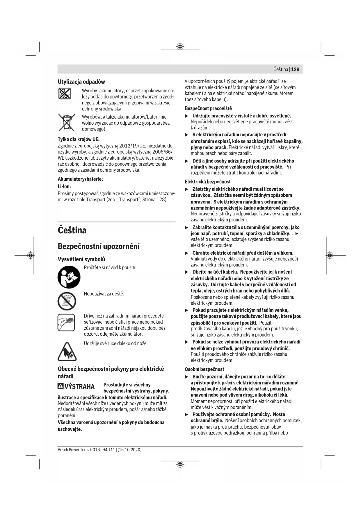 EU prohlášení oshodě Prohlašujeme na výhradní zodpovědnost, že uvedený výrobek splňuje všechna příslušná ustanovení níže uvedených směrnic anařízení aje vsouladu snásledujícími normami:* Bosch Power Tools F 016 L94 111 | (16.10.2020)II Akumulátorové nůžky na živý plot Objednací číslo