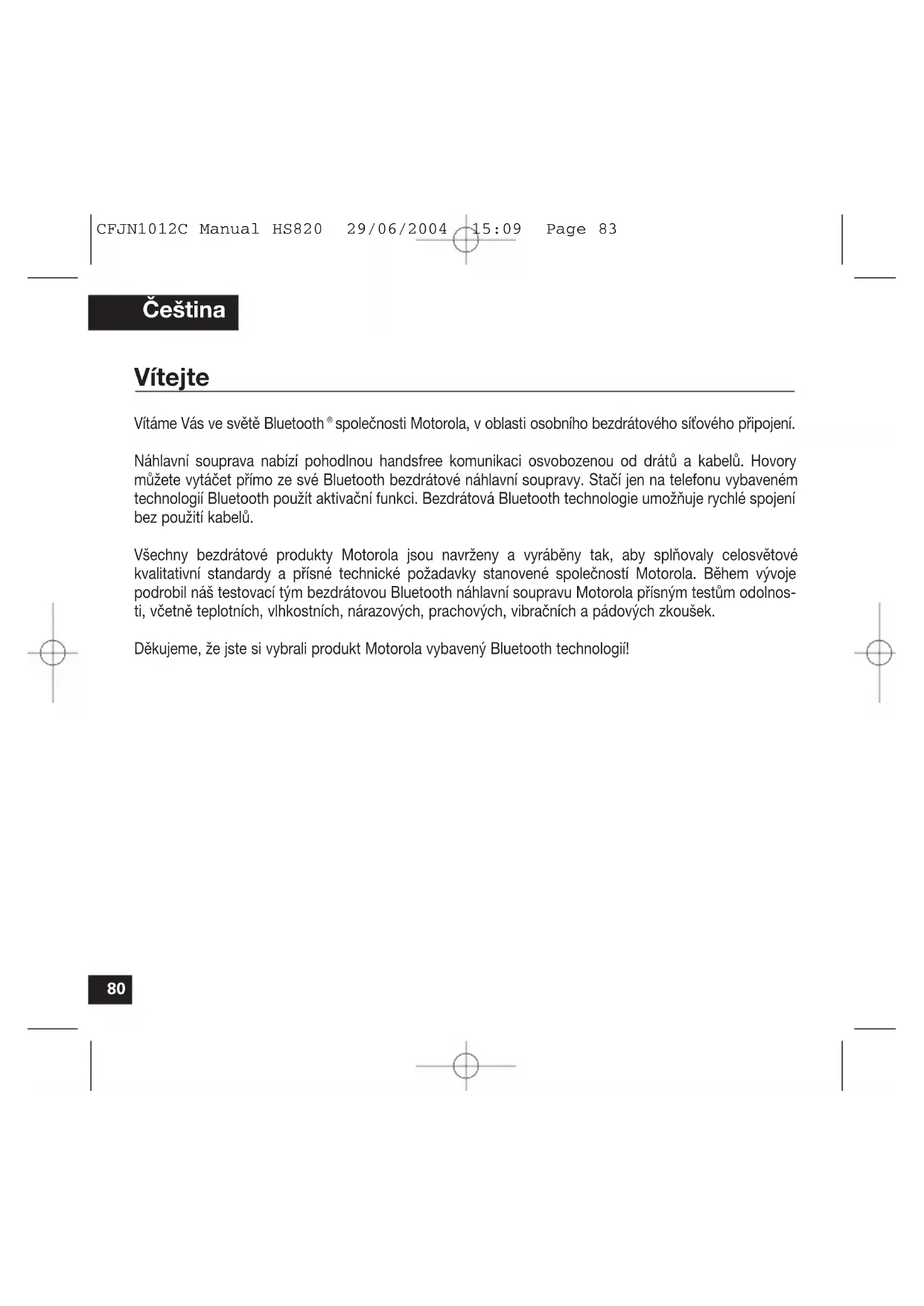 - Základní požadavky směrnice Evropské unie 1995/5/EC Prohlášení o shodě (Declaration of Conformity - DoC) se směrnicí 1995/5/EC (směrnice R&TTE) pro Váš produkt můžete najít na stánkách www.motorola.com/rtte. Elektromagnetické vlnění a kompatibilita Téměř každé elektronické zařízení může být ovlivněno působením elektromagnetického vlnění (EMI), pokud je nedostatečně stíněno, nesprávně navrženo nebo jiným způsobem konfigurováno z hlediska elektromagnetické compatibility. CFJN1012C Manual HS820 29/06/2004 15:09 Page 84Úvod Co je to bezdrátová technologie Bluetooth? Bezdrátová technologie Bluetooth vás přenese do nové dimenze konektivity. Bluetooth zařízení komunikují bezdrátově za použití vestavěných rádiových vysílačů/přijímačů, které pracují na globálně dostupných rádiových frekvencích. Tak je zajištěna celosvětová slučitelnost. Vaše bezdrátová Bluetooth náhlavní souprava může komunikovat s jiným Bluetooth zařízením na vzdálenost až 10 metrů. Jak používat bezdrátovou náhlavní soupravu? Propojením vaší bezdrátové náhlavní soupravy vybavené technologií Bluetooth s jinými podobně vybavenými zařízeními získáte řadu výhod: