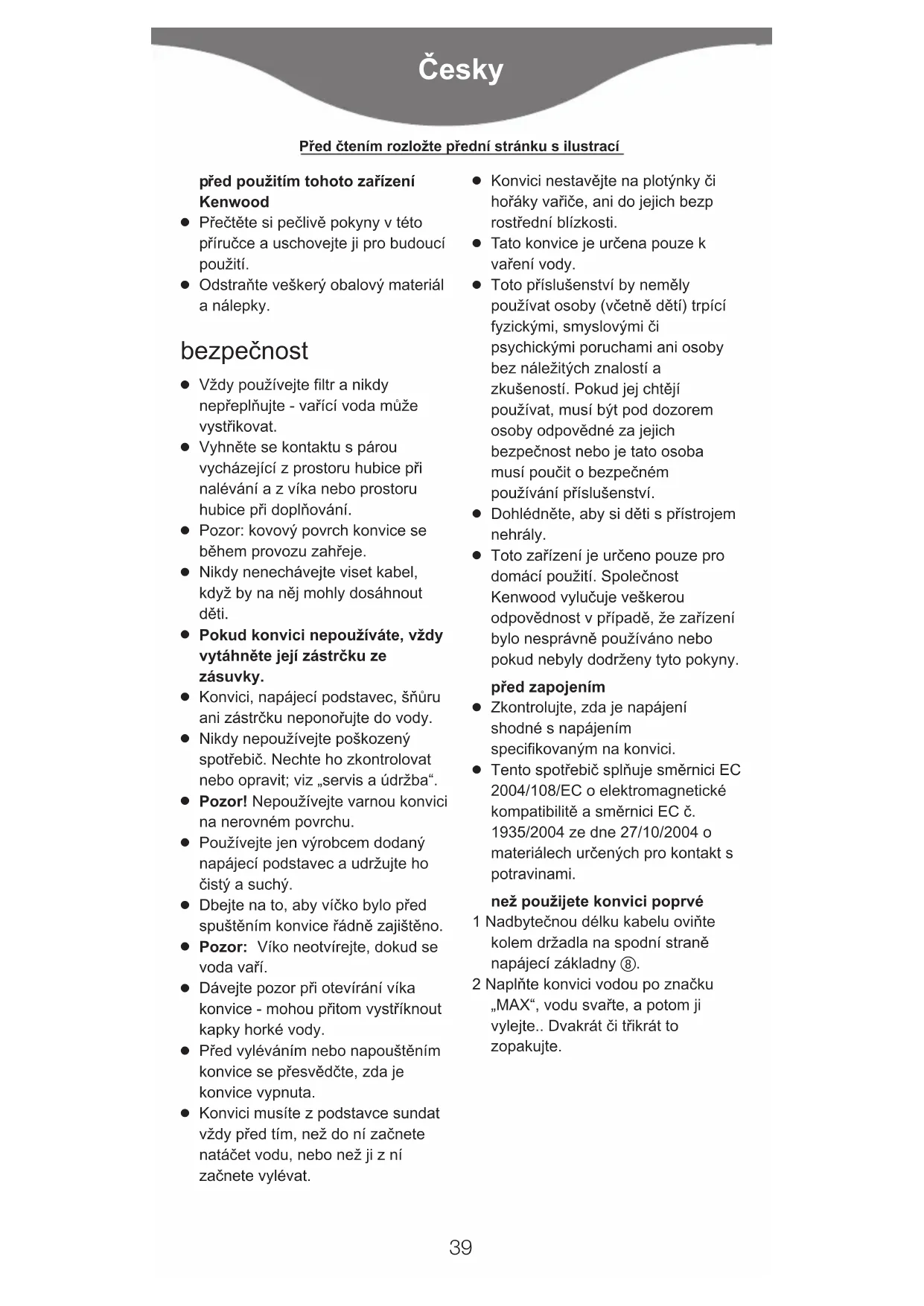 Tento spotřebič splňuje směrnici EC 2004/108/EC o elektromagnetické kompatibilitě a směrnici EC č. 1935/2004 ze dne 27/10/2004 o materiálech určených pro kontakt s potravinami. než použijete konvici poprvé 1 Nadbytečnou délku kabelu oviňte kolem držadla na spodní straně napájecí základny 햹. 2 Naplňte konvici vodou po značku „MAX“, vodu svařte, a potom ji vylejte.. Dvakrát ïi t¡ikrát to zopakujte.
