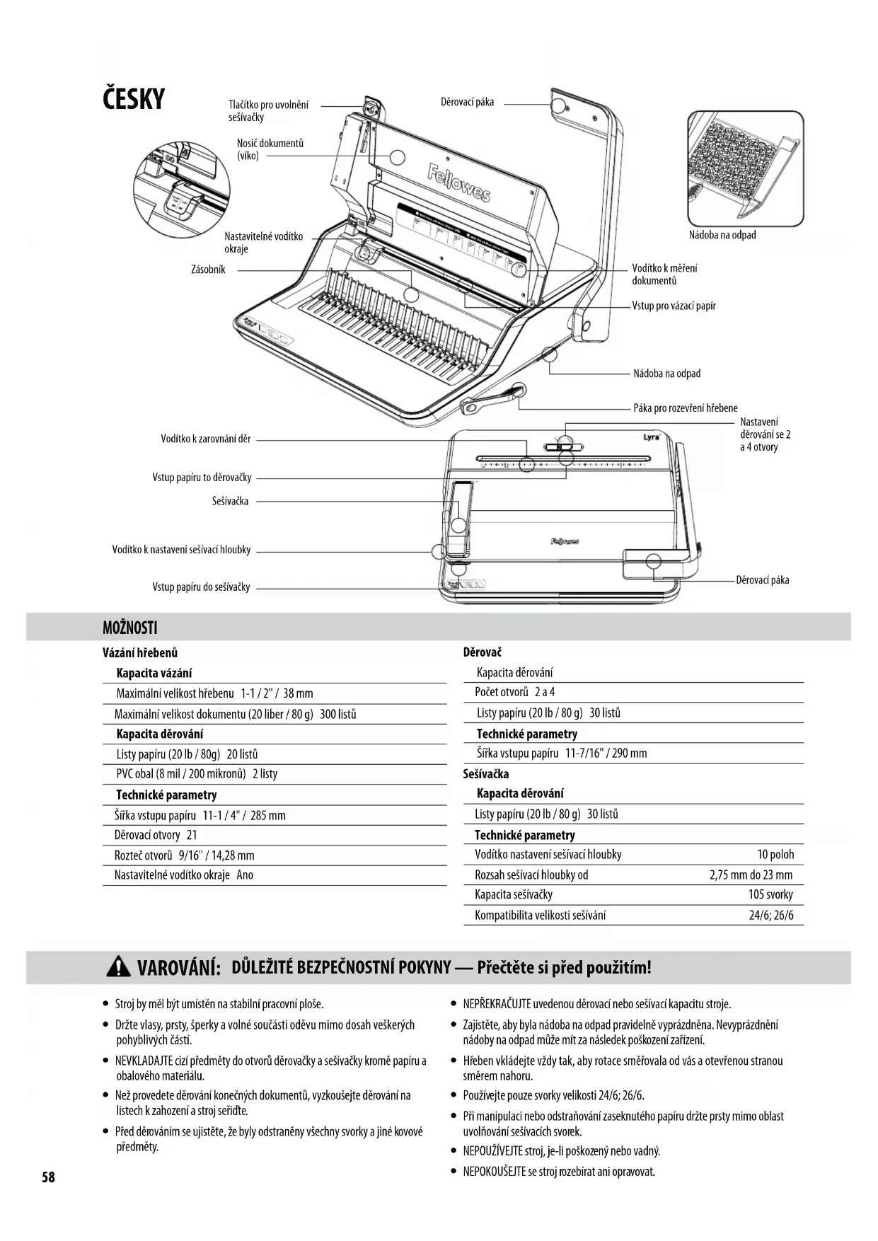 Problém Vyražené otvory nejsou vystředěné Stroj neděruje Děrované otvory nejsou rovnoběžné s okrajem Částečné otvory Poškozené okraje děrovaného otvoru Únik odpadu z nádoby na odpad Problém Neúplné údery Otvory nejsou zarovnány k okraji papíru Otvory nejsou na papíře vystředěné Problém Zaseknutí sešívačky Sešívačka se neotevře Sešívání příliš blízko okraje papíru Při nastavování papíru se vodítko sešívací hloubky pohybuje Příčina Není nastaveno vodítko okraje Zablokování Odřezky uvízly pod razidlem Listy nejsou správně zarovnány na vodítko děrování Pravděpodobné přetížení stroje Zásobník na odpad není správně vložen nebo je plný Příčina V razidle se stále nachází starý papír Nádoba na odpad je příliš plná V razidle se stále nacházejí útržky papíru Papír není správně nastaven Příčina Neúplný úder, nebo překročení kapacity papíru Tlačítko uvolnění sešívačky nebylo stisknuto Vodítko hloubky sešívačky není správně nastaveno Příliš silný tlak na vodítko Řešení Nastavte vodítko okraje na správný rozměr papíru nebo obálky. Zkontrolujte, zda je nádoba na odpad prázdná. Zkontrolujte průchodnost vstupního otvoru pro papír Zasuňte pevný karton do vstupního otvoru pro papír. Posuňte karton do strany tak, aby se volné odřezky uvolnily do nádoby na odpad Nastavte vodítko okraje a otestujte děrování na odpadním papíru, dokud nebude vzorec otvorů správný Plastové obaly děrujte spolu s listy papíru. Snižte počet děrovaných listů Zkontrolujte, zda je nádoba na odpad prázdná a správně uzavřená Řešení Aniž byste vkládali papír, použijte rukojeť k odstranění veškerých zbytků papíru z děr Prázdná nádoba na odpad Pohybem papíru ze strany na stranu v krčku odstraníte zbytky papíru Před děrováním vyrovnejte papír na levé straně krčku Řešení K odstranění zaseknutého papíru otevřete sešívací mechanismus pomocí tužky Stiskněte tlačítko uvolnění sešívačky Nastavte vodítko sešívací hloubky do požadované polohy Před nastavením vodítka papír narovnejte a poté jej jemně uložte do polohy62 SLOVENSKY VÝSTRAHA: FUNKČNOSŤ Rúčka na perforovanie Podpora dokumentov (veko) Podnos na odpad Rúčka na perforovanie Prepínač 2-otvorového a 4-otvorového dierovača Zásobovací priestor Nastaviteľná vodiaca lišta okrajov Otváracia páčka hrebeňa Sprievodca mierkou dokumentu Vstup pre viazaný papier Podnos na odpad Tlačidlo uvoľnenia zošívačky Viazanie hrebeňov Kapacita viazania Maximálna veľkosť hrebeňa 1-1/2”/38 mm Max. počet (20 lb/80 g) 300 listov dokumentu Kapacita perforovania Listy papiera (20 lb/80 g) 20 listov PVC kryty (8 mil/200 mikrónov) 2 listy Technické údaje Šírka vstupu papiera 11-1/4”/285 mm Perforačné otvory 21 Rozstup otvorov 9/16”/14,28 mm Nastaviteľná vodiaca lišta okrajov Áno Dierovač Kapacita perforovania Počet otvorov 2 a 4 Listy papiera (20 lb/80 g) 30 listov Technické údaje Šírka vstupu papiera 11-7/16"/290 mm Zošívačka Kapacita perforovania Listy papiera (20 lb/80 g) 30 listov Technické údaje Nastaviteľné hĺbkové vodidlo zošívačky 10 pozícií Hĺbka zošívačky v rozsahu 2,75 mm až 23 mm Kapacita zošívačky 105 spony Kompatibilita veľkosti zošívania 24/6; 26/6 Zošívačka Zarovnávacie vodidlo dierovača Nastaviteľné hĺbkové vodidlo zošívačky Vstup papiera do zošívačky Vstup papiera do dierovača t Zariadenie by malo byť umiestnené na stabilnom pracovnom povrchu. t Vlasy, prsty, šperky a voľné oblečenie udržiavajte mimo dosahu pohyblivých častí. t Do otvorov dierovača a zošívačky okrem papiera a obalového materiálu NEVKLADAJTE cudzie predmety. t Pred perforovaním konečných dokumentov najprv vyskúšajte perforovať nepotrebné hárky a zariadenie nastavte podľa potreby. t Pred perforovaním sa uistite, že boli odstránené všetky svorky a iné kovové predmety. t NEPREKRAČUJTE uvedenú kapacitu perforovania alebo zošívania daného zariadenia. t Skontrolujte, či sa podnos na odpad pravidelne vyprázdňuje. Nevyprázdnenie podnosu na odpad môže mať za následok poškodenie zariadenia. t Hrebeň vkladajte vždy tak, aby bol chrbát otočený smerom od vás a otvorená strana smerovala nahor. t Používajte iba spony veľkosti 24/6, 26/6. t Pri manipulácii alebo pri odstraňovaní zaseknutého papiera držte prsty mimo oblasti, kde sa nachádzajú spony zošívačky. t NEPOUŽÍVAJTE, ak je zariadenie poškodené alebo chybné. t NEPOKÚŠAJTE sa zariadenie rozoberať ani opravovať. DÔLEŽITÉ BEZPEČNOSTNÉ POKYNY - Prečítajte pred použitím!63 PRIEMER HREBEŇA A VEĽKOSTI DOKUMENTOV