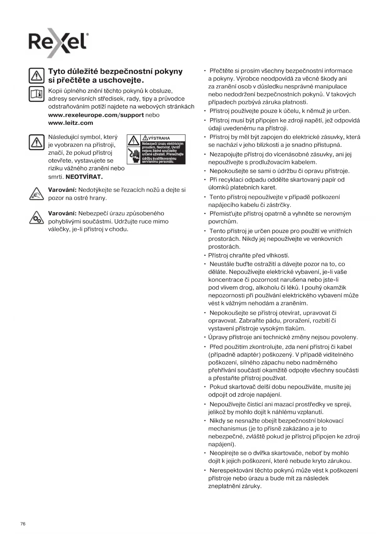 - Nerespektování těchto pokynů může vést k poškození přístroje nebo úrazu a bude mít za následek zneplatnění záruky. Tyto důležité bezpečnostní pokyny si přečtěte a uschovejte. Kopii úplného znění těchto pokynů k obsluze, adresy servisních středisek, rady, tipy a průvodce odstraňováním potíží najdete na webových stránkách www.rexeleurope.com/support nebo www.leitz.com Varování: Nedotýkejte se řezacích nožů a dejte si pozor na ostré hrany. Varování: Nebezpečí úrazu způsobeného pohyblivými součástmi. Udržujte ruce mimo válečky, je-li přístroj v chodu.777777 Udržujte volně visící šperky/bižuterii v bezpečné vzdálenosti od podávacího otvoru Udržujte volné oblečení a kravaty v bezpečné vzdálenosti od podávacího otvoru Varovné symboly Udržujte dlouhé vlasy v bezpečné vzdálenosti od podávacího otvoru Nevkládejte ruce do podávacího otvoru přístroje Varovné symboly Kapacita (počet listů) Žádné disky CD Žádné velké svorky větší než 26 mm Varování: pohyblivé součásti Tento přístroj není určen pro použití dětmi Nepoužívejte aerosoly. Nepoužívejte čisticí ani mazací prostředky ve spreji, jelikož by mohlo dojít k náhlému vzplanutí. Ikona Typ Posuvný spínač / indikátor a příslušná funkce Ovládací tlačítka Tlačítko automatického spuštění a pohotovostního režimu (stiskněte jedenkrát) Tlačítko ručního zpětného chodu (podržte) Tlačítko ručního dopředného chodu (podržte) Indikátor přehřátí (počkejte, dokud skartovač nevychladne) Indikátor přeplnění / indikátor zaseknutí (snižte počet listů / odstraňte zaseknutí) Modely s tlačítky Ikona Typ Posuvný spínač / indikátor a příslušná funkce Posuvný spínač Automatické spuštění (přesuňte do polohy pro skartaci) Zpětný chod (přesuňte do odpovídající polohy) Chod vpřed (přesuňte do odpovídající polohy) Indikátory stavu Vypnuto (přesuňte do odpovídající polohy) Indikátor připravenosti k provozu (ujistěte se, že skartovač je umístěn na koši a posuvný spínač je v poloze pro automatické spuštění) Indikátor přehřátí (nechejte skartovač vychladnout) Ovládací prvky a indikátory Modely s posuvným spínačem Žádné kreditní karty Doplňky Používejte pouze doplňky Rexel: Olejové obálky (20) - 2101949 Olejové obálky (12) - 210194878 Silný papír nebo karton < 200 g/m². Více složených papírů (listy A3 složené na polovinu). Lesklý papír nebo papír potištěný po obou stranách. CD a DVD disky Nepoužívejte aerosoly Žádný olej, pouze olejové listy Skartovací možnosti CAN skartuje následující: