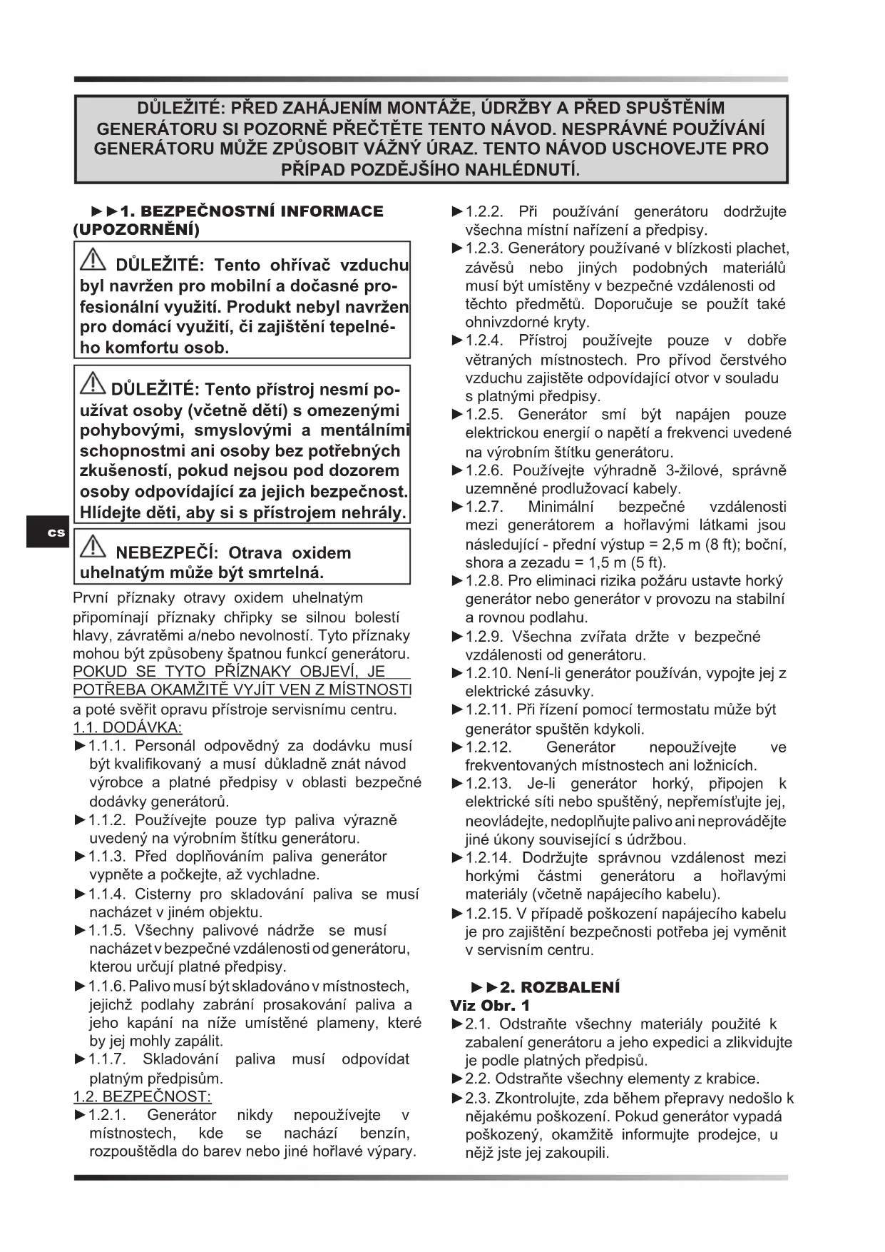 (UPOZORNĚNÍ) DŮLEŽITÉ: Tento ohřívač vzduchu byl navržen pro mobilní a dočasné pro- fesionální využití. Produkt nebyl navržen pro domácí využití, či zajištění tepelné- ho komfortu osob. DŮLEŽITÉ: Tento přístroj nesmí po- užívat osoby (včetně dětí) s omezenými pohybovými, smyslovými a mentálními schopnostmi ani osoby bez potřebných zkušeností, pokud nejsou pod dozorem osoby odpovídající za jejich bezpečnost. Hlídejte děti, aby si s přístrojem nehrály. NEBEZPEČÍ: Otrava oxidem uhelnatým může být smrtelná. První příznaky otravy oxidem uhelnatým připomínají příznaky chřipky se silnou bolestí hlavy, závratěmi a/nebo nevolností. Tyto příznaky mohou být způsobeny špatnou funkcí generátoru. POKUD SE TYTO PŘÍZNAKY OBJEVÍ, JE POTŘEBA OKAMŽITĚ VYJÍT VEN Z MÍSTNOSTI a poté svěřit opravu přístroje servisnímu centru. 1.1. DODÁVKA: ►1.1.1. Personál odpovědný za dodávku musí být kvalikovaný a musí důkladně znát návod výrobce a platné předpisy v oblasti bezpečné dodávky generátorů. ►1.1.2. Používejte pouze typ paliva výrazně uvedený na výrobním štítku generátoru. ►1.1.3. Před doplňováním paliva generátor vypněte a počkejte, až vychladne. ►1.1.4. Cisterny pro skladování paliva se musí nacházet v jiném objektu. ►1.1.5. Všechny palivové nádrže se musí nacházet v bezpečné vzdálenosti od generátoru, kterou určují platné předpisy. ►1.1.6. Palivo musí být skladováno v místnostech, jejichž podlahy zabrání prosakování paliva a jeho kapání na níže umístěné plameny, které by jej mohly zapálit. ►1.1.7. Skladování paliva musí odpovídat platným předpisům. 1.2. BEZPEČNOST: ►1.2.1. Generátor nikdy nepoužívejte v místnostech, kde se nachází benzín, rozpouštědla do barev nebo jiné hořlavé výpary. ►1.2.2. Při používání generátoru dodržujte všechna místní nařízení a předpisy. ►1.2.3. Generátory používané v blízkosti plachet, závěsů nebo jiných podobných materiálů musí být umístěny v bezpečné vzdálenosti od těchto předmětů. Doporučuje se použít také ohnivzdorné kryty. ►1.2.4. Přístroj používejte pouze v dobře větraných místnostech. Pro přívod čerstvého vzduchu zajistěte odpovídající otvor v souladu s platnými předpisy. ►1.2.5. Generátor smí být napájen pouze elektrickou energií o napětí a frekvenci uvedené na výrobním štítku generátoru. ►1.2.6. Používejte výhradně 3-žilové, správně uzemněné prodlužovací kabely. ►1.2.7. Minimální bezpečné vzdálenosti mezi generátorem a hořlavými látkami jsou následující - přední výstup = 2,5 m (8 ft); boční, shora a zezadu = 1,5 m (5 ft). ►1.2.8. Pro eliminaci rizika požáru ustavte horký generátor nebo generátor v provozu na stabilní a rovnou podlahu. ►1.2.9. Všechna zvířata držte v bezpečné vzdálenosti od generátoru. ►1.2.10. Není-li generátor používán, vypojte jej z elektrické zásuvky. ►1.2.11. Při řízení pomocí termostatu může být generátor spuštěn kdykoli. ►1.2.12. Generátor nepoužívejte ve frekventovaných místnostech ani ložnicích. ►1.2.13. Je-li generátor horký, připojen k elektrické síti nebo spuštěný, nepřemísťujte jej, neovládejte, nedoplňujte palivo ani neprovádějte jiné úkony související s údržbou. ►1.2.14. Dodržujte správnou vzdálenost mezi horkými částmi generátoru a hořlavými materiály (včetně napájecího kabelu). ►1.2.15. V případě poškození napájecího kabelu je pro zajištění bezpečnosti potřeba jej vyměnit v servisním centru. ►►2. ROZBALENÍ Viz Obr. 1 ►2.1. Odstraňte všechny materiály použité k zabalení generátoru a jeho expedici a zlikvidujte je podle platných předpisů. ►2.2. Odstraňte všechny elementy z krabice. ►2.3. Zkontrolujte, zda během přepravy nedošlo k nějakému poškození. Pokud generátor vypadá poškozený, okamžitě informujte prodejce, u nějž jste jej zakoupili.