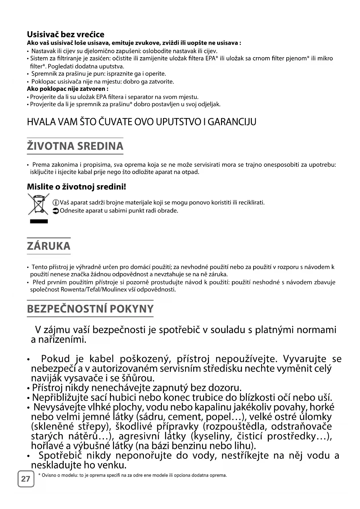 - V případě, že máte potíže se získáním příslušenství a ltrů na tento vysavač, obraťte se na zákaznický servis Rowenta/Tefal/Moulinex. • Máte-li typ se sáčkem :Nepouštějte vysavač bez sáčku a bez ltračního systému (ltrační kazeta*, ltr*, pěnový ltr*, mikroltr*).Používejte pouze originální sáčky a ltry Rowenta/Tefal/Moulinex.