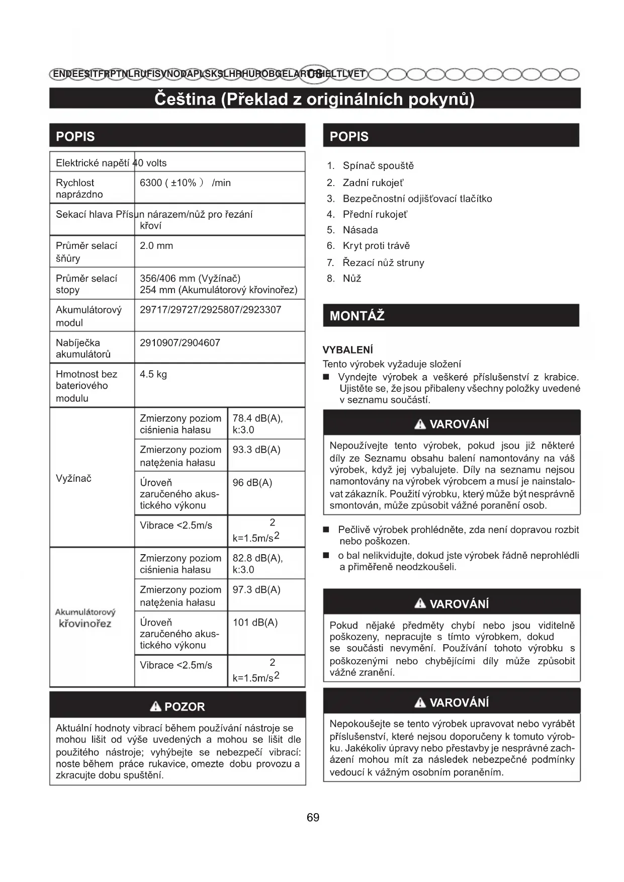 EN DE ES IT FR PT NL RU FI SV NO DA PL SK SL HR HU RO BG EL AR TR HE LT LV ET POPIS Elektrické napětí 40 volts Rychlost naprázdno 6300 ( ±10% ) /min Sekací hlava Přísun nárazem/nůž pro řezání křoví Průměr selací šňůry