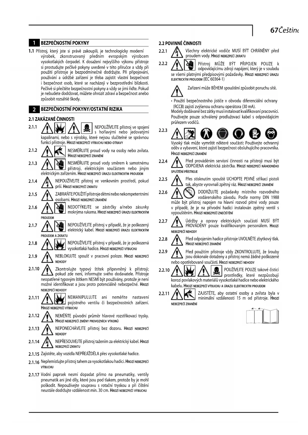 Vysoký tlak může vymrštit některé součásti: Používejte ochranný oděv a vybavení, které zajistí bezpečnost obsluhujícího pracovníka. hrozí neBezpečí zranění Před prováděním servisní činnosti na přístroji musí být ODPOJENA elektrická zástrčka. hrozí neBezpečí náhodného spuštění přístroje Přes stisknutím spouště UCHOPTE PEVNĚ stříkací pistoli tak, abyste vyrovnali zpětný ráz. hrozí neBezpečí zranění