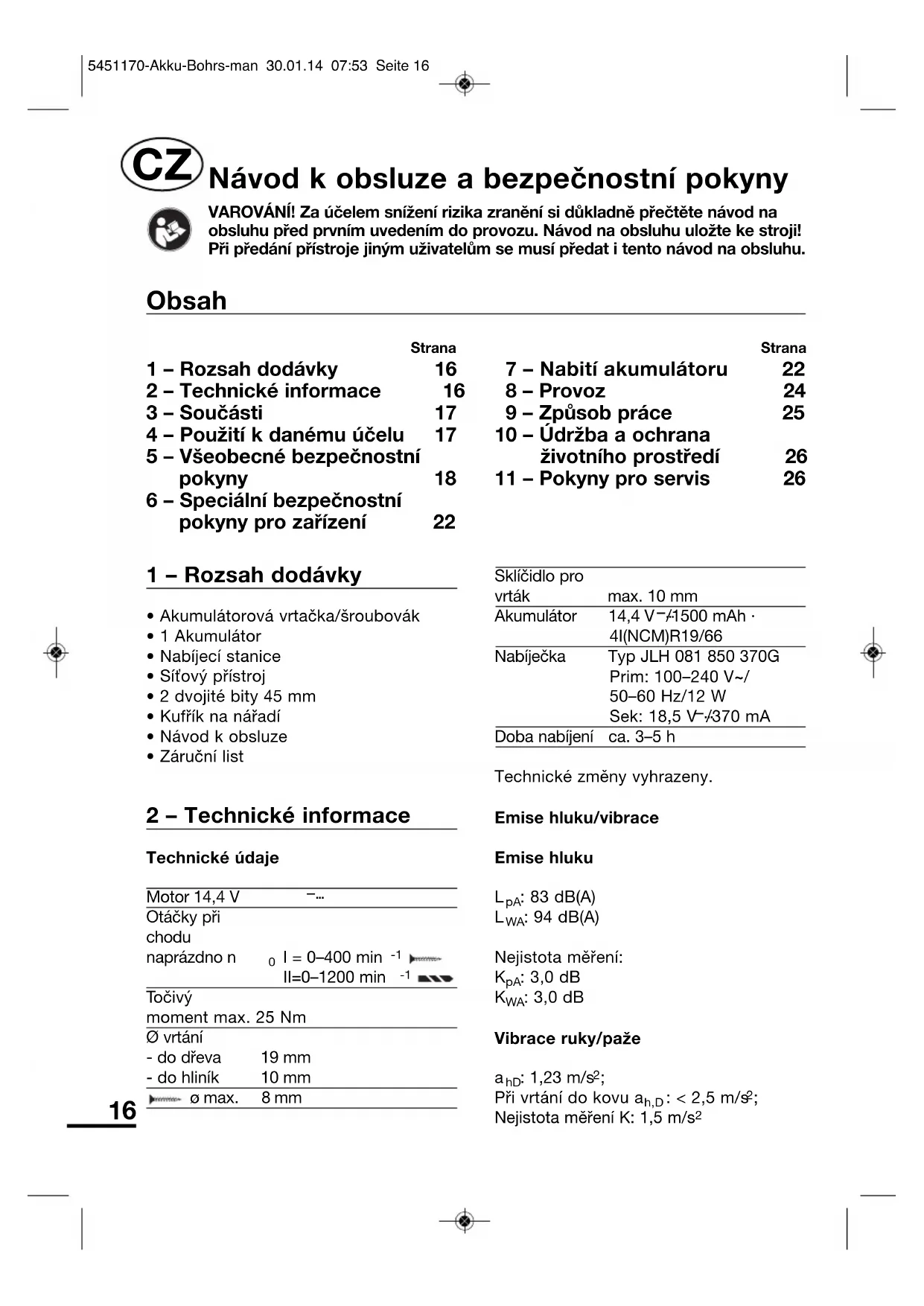 - Akumulátorová vrtačka/šroubovák• 1 Akumulátor• Nabíjecí stanice• Síťový přístroj• 2 dvojité bity 45 mm• Kufřík na nářadí• Návod k obsluze• Záruční list 2 – Technické informace Technické údajeMotor 14,4 V–...Otáčky přichodunaprázdno n I = 0–400 min II = 0–1200 min To č i v ýmoment max. 25 NmØ vrtání- do dřeva 19 mm- do hliník 10 mmø max. 8 mmSklíčidlo provrták max. 10 mmAkumulátor 14,4 V–.../1500 mAh · 4I(NCM)R19/66Nabíječka Typ JLH 081 850 370GPrim: 100–240 V~/50–60 Hz/12 WSek: 18,5 V–.../370 mADoba nabíjení ca. 3–5 hTechnické změny vyhrazeny.Emise hluku/vibraceEmise hluku