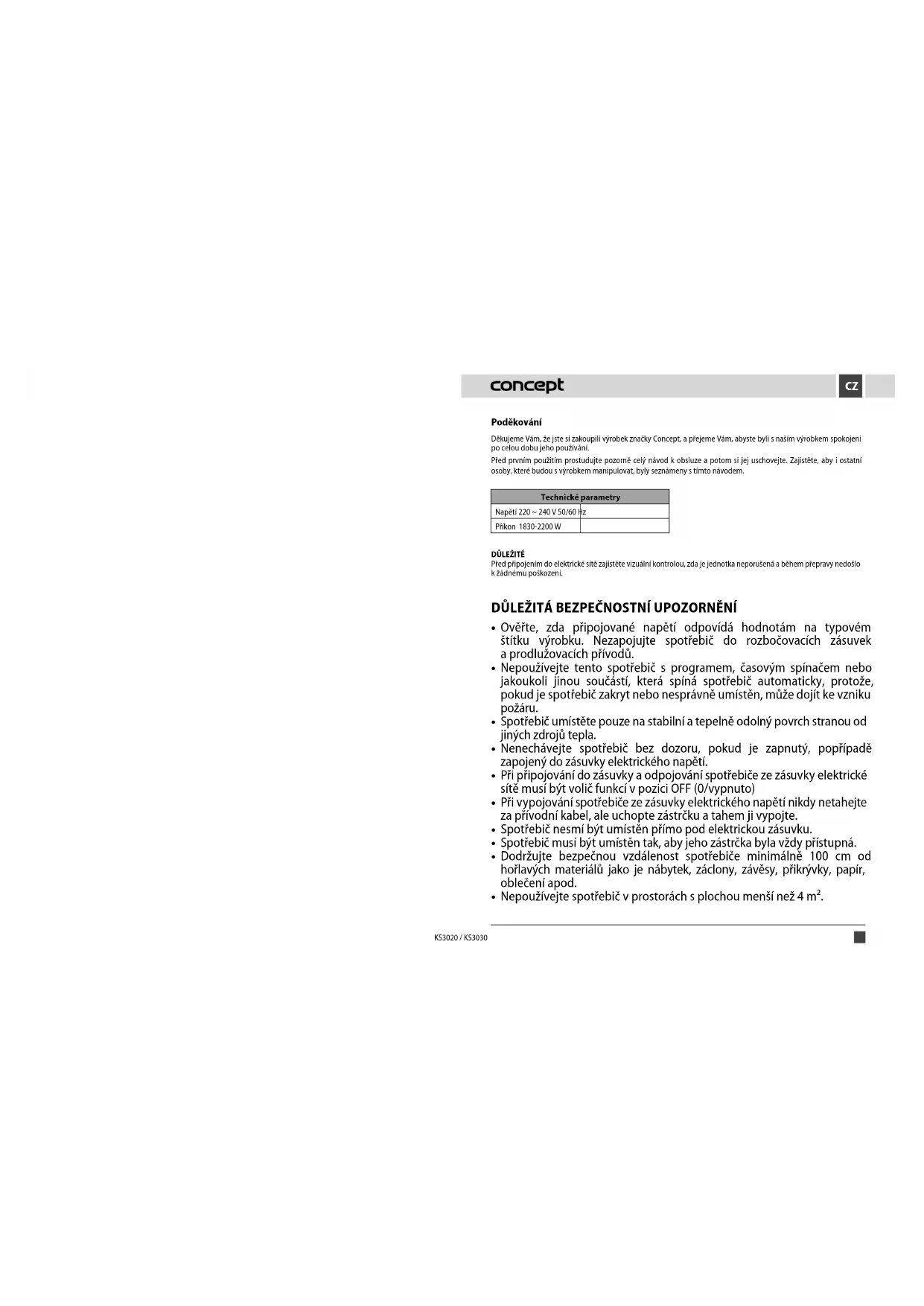 ENSK PL HU LV DE FR IT ES2 3 KS3020 / KS3030 KS3020 / KS3030 CZCZ Poděkování Děkujeme Vám, že jste si zakoupili výrobek značky Concept, a přejeme Vám, abyste byli s naším výrobkem spokojeni po celou dobu jeho používání. Před prvním použitím prostudujte pozorně celý návod k obsluze a potom si jej uschovejte. Zajistěte, aby i ostatní osoby, které budou s výrobkem manipulovat, byly seznámeny s tímto návodem. Technické parametry Napětí 220 ~ 240 V 50/60 Hz Příkon 1830-2200 W