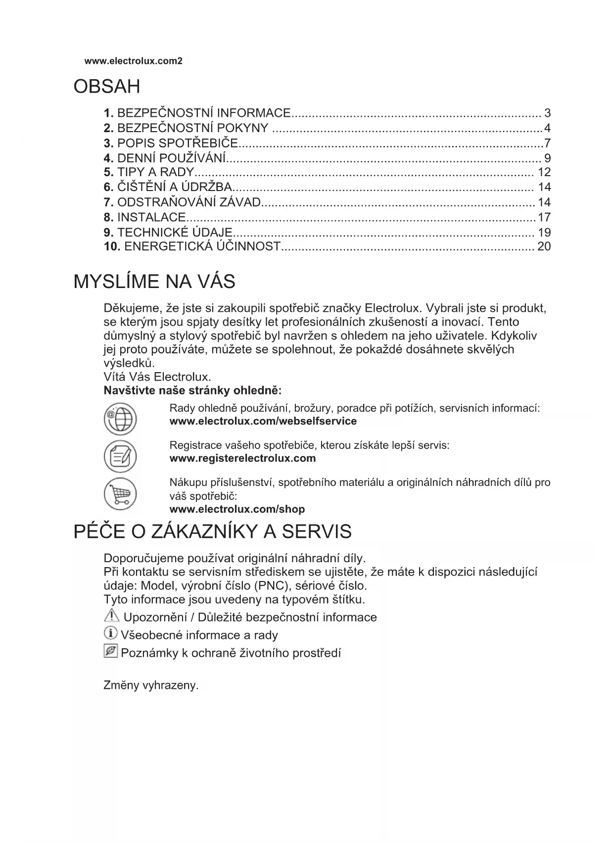 Děkujeme, že jste si zakoupili spotřebič značky Electrolux. Vybrali jste si produkt, se kterým jsou spjaty desítky let profesionálních zkušeností a inovací. Tento důmyslný a stylový spotřebič byl navržen s ohledem na jeho uživatele. Kdykoliv jej proto používáte, můžete se spolehnout, že pokaždé dosáhnete skvělých výsledků. Vítá Vás Electrolux. Navštivte naše stránky ohledně: Rady ohledně používání, brožury, poradce při potížích, servisních informací: www.electrolux.com/webselfservice Registrace vašeho spotřebiče, kterou získáte lepší servis: www.registerelectrolux.com Nákupu příslušenství, spotřebního materiálu a originálních náhradních dílů pro váš spotřebič: www.electrolux.com/shop PÉČE O ZÁKAZNÍKY A SERVIS Doporučujeme používat originální náhradní díly. Při kontaktu se servisním střediskem se ujistěte, že máte k dispozici následující údaje: Model, výrobní číslo (PNC), sériové číslo. Tyto informace jsou uvedeny na typovém štítku. Upozornění / Důležité bezpečnostní informace Všeobecné informace a rady Poznámky k ochraně životního prostředí Zmĕny vyhrazeny. www.electrolux.com21. BEZPEČNOSTNÍ INFORMACE Tento návod si pečlivě přečtěte ještě před instalací spotřebiče a jeho prvním použitím. Výrobce nenese odpovědnost za žádný úraz ani škodu v důsledku nesprávné instalace nebo použití. Návod k použití vždy uchovávejte na bezpečném a přístupném místě pro jeho budoucí použití.