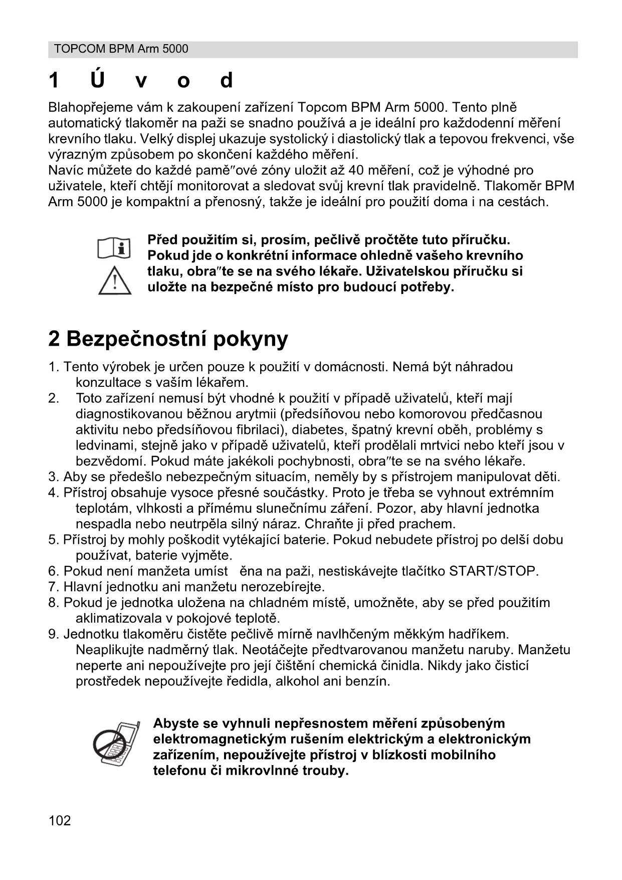 Neaplikujte nadmrný tlak. Neotáejte pedtvarovanou manžetu naruby. Manžetu neperte ani nepoužívejte pro její ištní chemická inidla. Nikdy jako isticí prostedek nepoužívejte edidla, alkohol ani benzín. Ped použitím si, prosím, peliv protte tuto píruku. Pokud jde o konkrétní informace ohledn vašeho krevního tlaku, obraste se na svého lékae. Uživatelskou píruku si uložte na bezpené místo pro budoucí poteby. Abyste se vyhnuli nepesnostem mení zpsobeným elektromagnetickým rušením elektrickým a elektronickým zaízením, nepoužívejte pístroj v blízkosti mobilního telefonu i mikrovlnné trouby.103 ESKY TOPCOM BPM Arm 5000 3 Krevní tlak