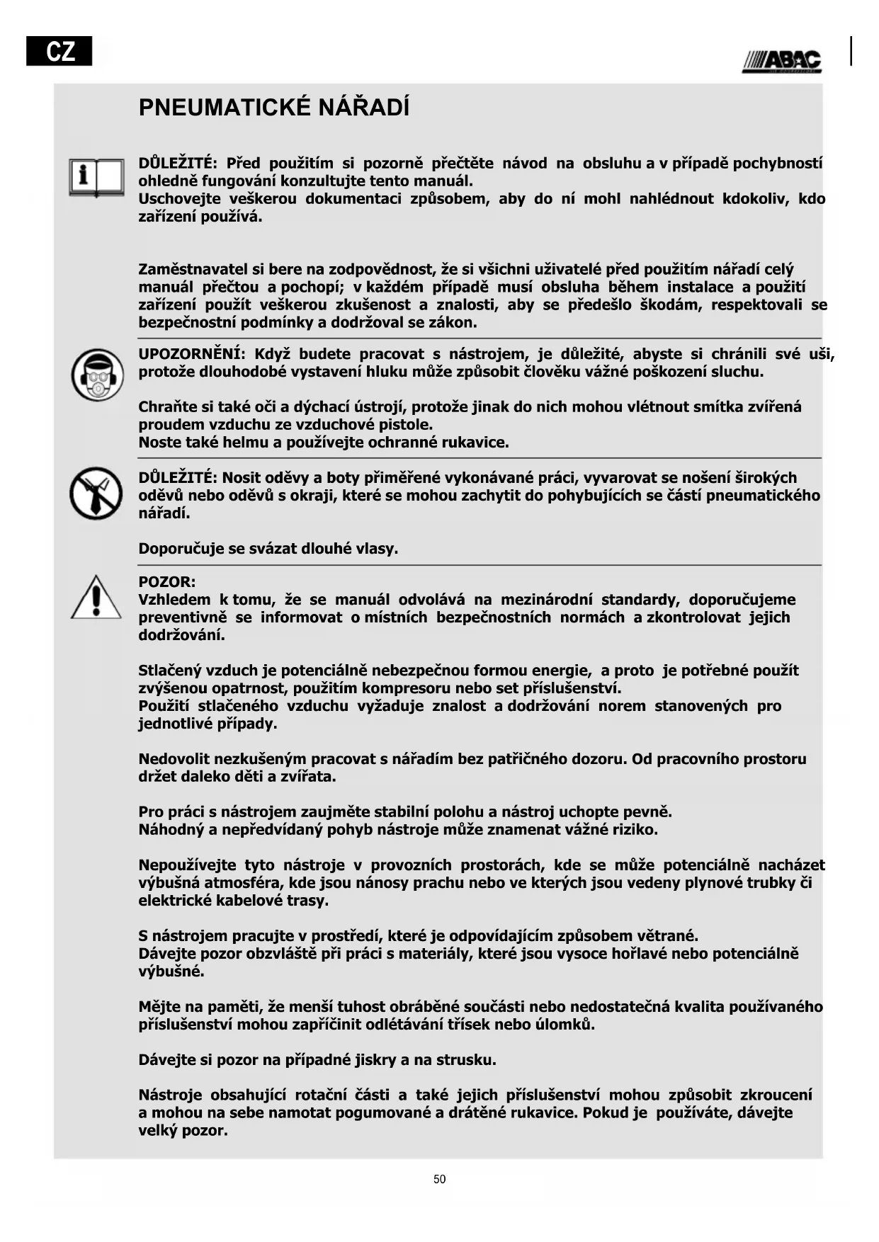 DŮLEŽITÉ: Před použitím si pozorně přečtěte návod na obsluhu a v případě pochybností ohledně fungování konzultujte tento manuál. Uschovejte veškerou dokumentaci způsobem, aby do ní mohl nahlédnout kdokoliv, kdo zařízení používá. Zaměstnavatel si bere na zodpovědnost, že si všichni uživatelé před použitím nářadí celý manuál přečtou a pochopí; v každém případě musí obsluha během instalace a použití zařízení použít veškerou zkušenost a znalosti, aby se předešlo škodám, respektovali se bezpečnostní podmínky a dodržoval se zákon. UPOZORNĚNÍ: Když budete pracovat s nástrojem, je důležité, abyste si chránili své uši, protože dlouhodobé vystavení hluku může způsobit člověku vážné poškození sluchu. Chraňte si také oči a dýchací ústrojí, protože jinak do nich mohou vlétnout smítka zvířená proudem vzduchu ze vzduchové pistole. Noste také helmu a používejte ochranné rukavice. DŮLEŽITÉ: Nosit oděvy a boty přiměřené vykonávané práci, vyvarovat se nošení širokých oděvů nebo oděvů s okraji, které se mohou zachytit do pohybujících se částí pneumatického nářadí. Doporučuje se svázat dlouhé vlasy. POZOR: Vzhledem k tomu, že se manuál odvolává na mezinárodní standardy, doporučujeme preventivně se informovat o místních bezpečnostních normách a zkontrolovat jejich dodržování. Stlačený vzduch je potenciálně nebezpečnou formou energie, a proto je potřebné použít zvýšenou opatrnost, použitím kompresoru nebo set příslušenství. Použití stlačeného vzduchu vyžaduje znalost a dodržování norem stanovených pro jednotlivé případy. Nedovolit nezkušeným pracovat s nářadím bez patřičného dozoru. Od pracovního prostoru držet daleko děti a zvířata. Pro práci s nástrojem zaujměte stabilní polohu a nástroj uchopte pevně. Náhodný a nepředvídaný pohyb nástroje může znamenat vážné riziko. Nepoužívejte tyto nástroje v provozních prostorách, kde se může potenciálně nacházet výbušná atmosféra, kde jsou nánosy prachu nebo ve kterých jsou vedeny plynové trubky či elektrické kabelové trasy. S nástrojem pracujte v prostředí, které je odpovídajícím způsobem větrané. Dávejte pozor obzvláště při práci s materiály, které jsou vysoce hořlavé nebo potenciálně výbušné. Mějte na paměti, že menší tuhost obráběné součásti nebo nedostatečná kvalita používaného příslušenství mohou zapříčinit odlétávání třísek nebo úlomků. Dávejte si pozor na případné jiskry a na strusku. Nástroje obsahující rotační části a také jejich příslušenství mohou způsobit zkroucení a mohou na sebe namotat pogumované a drátěné rukavice. Pokud je používáte, dávejte velký pozor.51