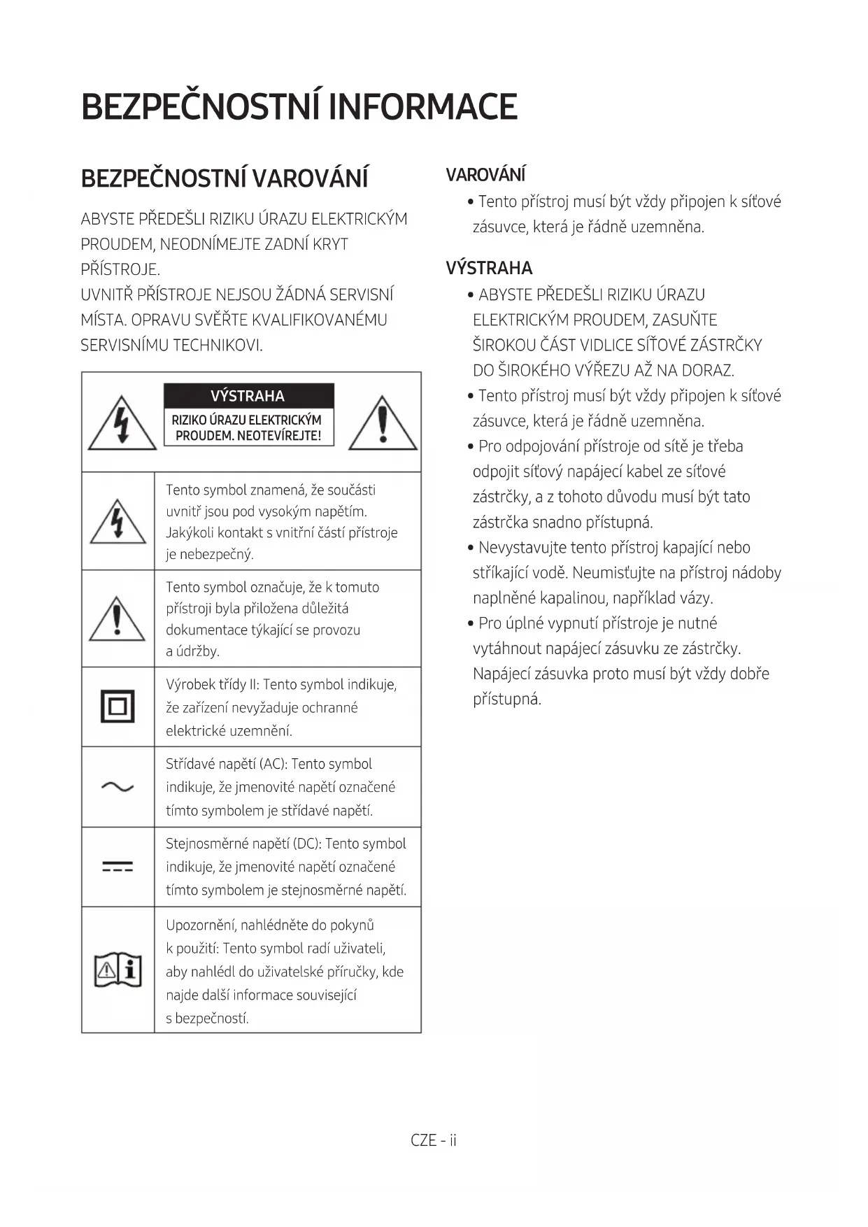 - Pro úplné vypnutí přístroje je nutné vytáhnout napájecí zásuvku ze zástrčky. Napájecí zásuvka proto musí být vždy dobře přístupná.CZE - iii BEZPEČNOSTNÍ OPATŘENÍ