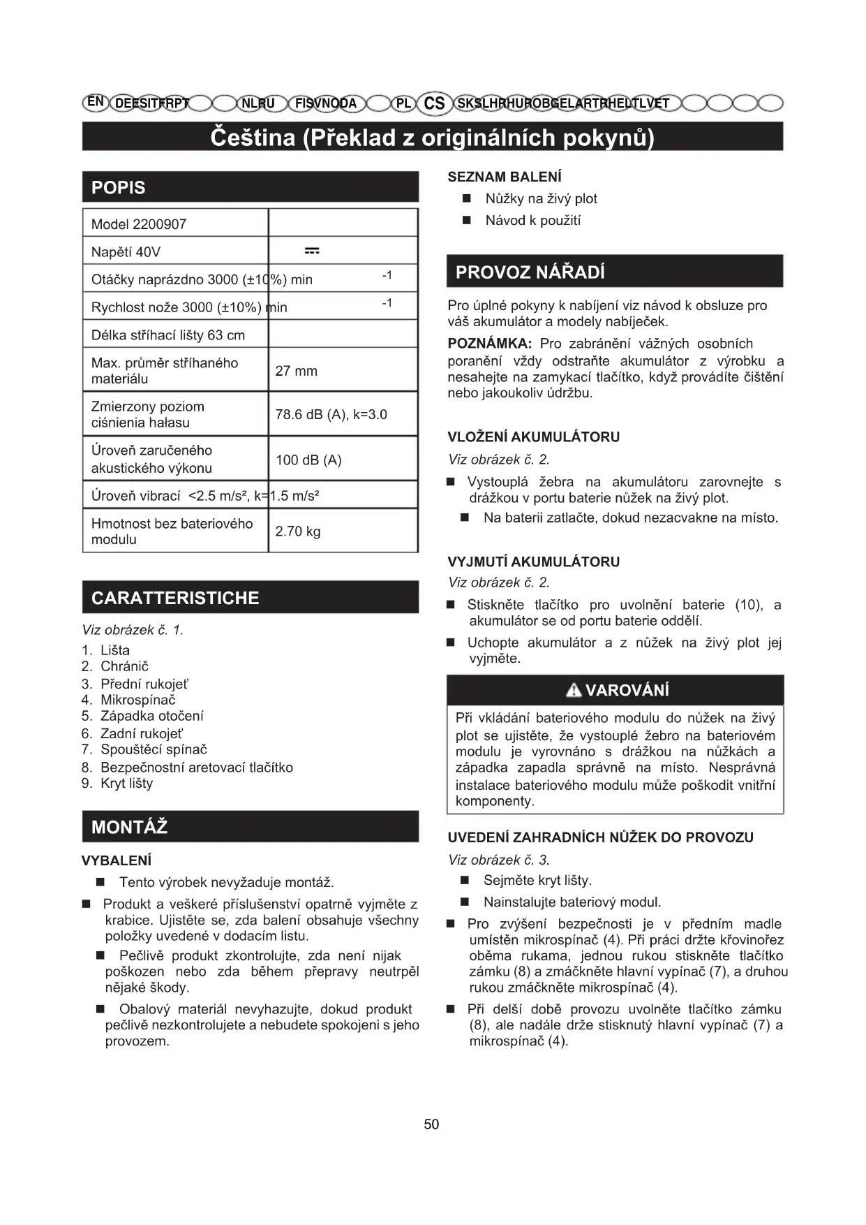 MONTÁŽ VYBALENÍ Tento výrobek nevyžaduje montáž. Produkt a veškeré příslušenství opatrně vyjměte z krabice. Ujistěte se, zda balení obsahuje všechny položky uvedené v dodacím listu. Pečlivě produkt zkontrolujte, zda není nijak poškozen nebo zda během přepravy neutrpěl nějaké škody. Obalový materiál nevyhazujte, dokud produkt pečlivě nezkontrolujete a nebudete spokojeni s jeho provozem. SEZNAM BALENÍ Nůžky na živý plot Návod k použití