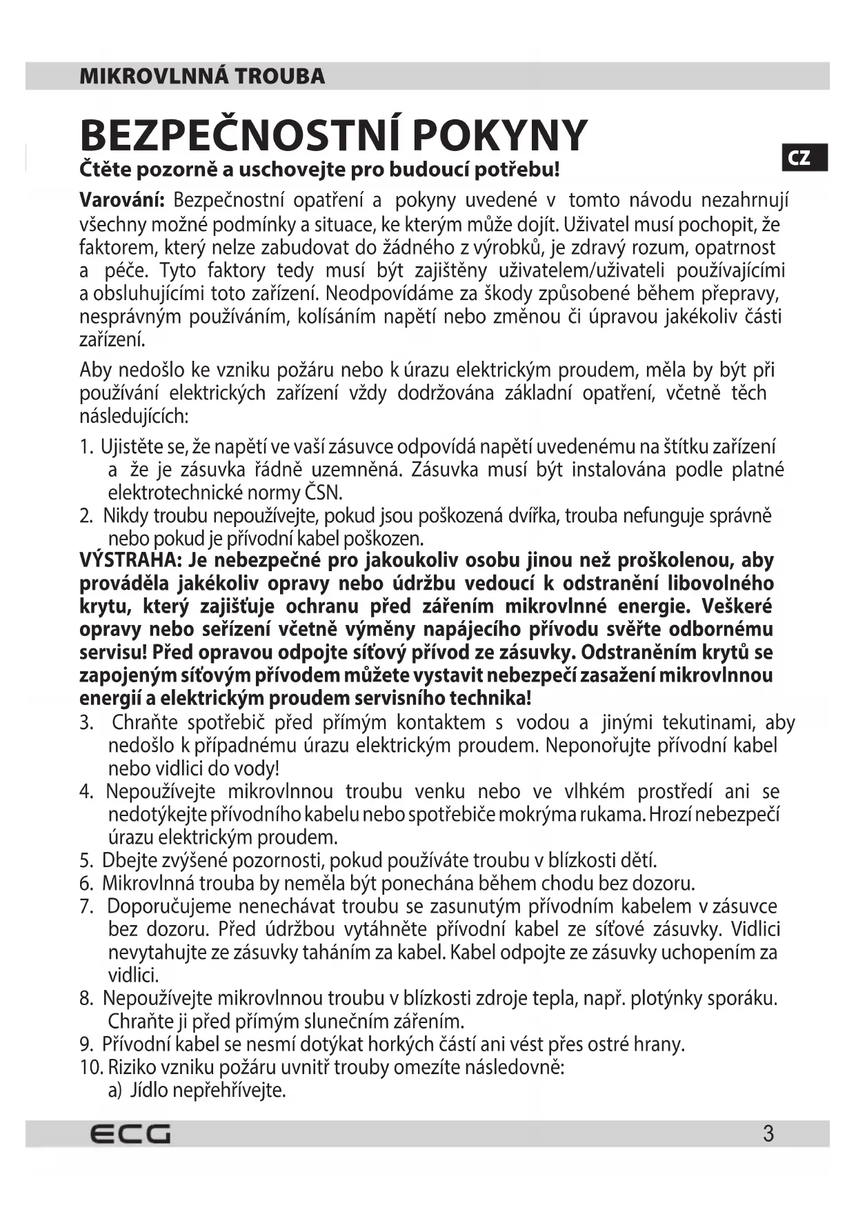 Balicí papír avlnitá lepenka – odevzdat do sběrných surovin. Přebalová folie, PE sáčky, plastové díly – do sběrných kontejnerů na plasty. LIKVIDACE VÝROBKU PO UKONČENÍ ŽIVOTNOSTI Likvidace použitých elektrických aelektronických zařízení (platí v členských zemích EU a dalších evropských zemích se zavedeným systémem třídění odpadu) Vyobrazený symbol na produktu nebo na obalu znamená, že sproduktem by nemělo být nakládáno jako sdomovním odpadem. Produkt odevzdejte na místo určené pro recyklaci elektrických aelektronických zařízení. Správnou likvidací produktu zabráníte negativním vlivům na lidské zdraví a životní prostředí. Recyklace materiálů přispívá k ochraně přírodních zdrojů. Více informací o recyklaci tohoto produktu Vám poskytne obecní úřad, organizace pro zpracování domovního odpadu nebo prodejní místo, kde jste produkt zakoupili. Tento výrobek splňuje požadavky směrnic EU oelektromagnetické kompatibilitě aelektrické bezpečnosti. Návod kobsluze je kdispozici na webových stránkách www.ecg-electro.eu. Změna textu atechnických parametrů vyhrazena. 08/05SK