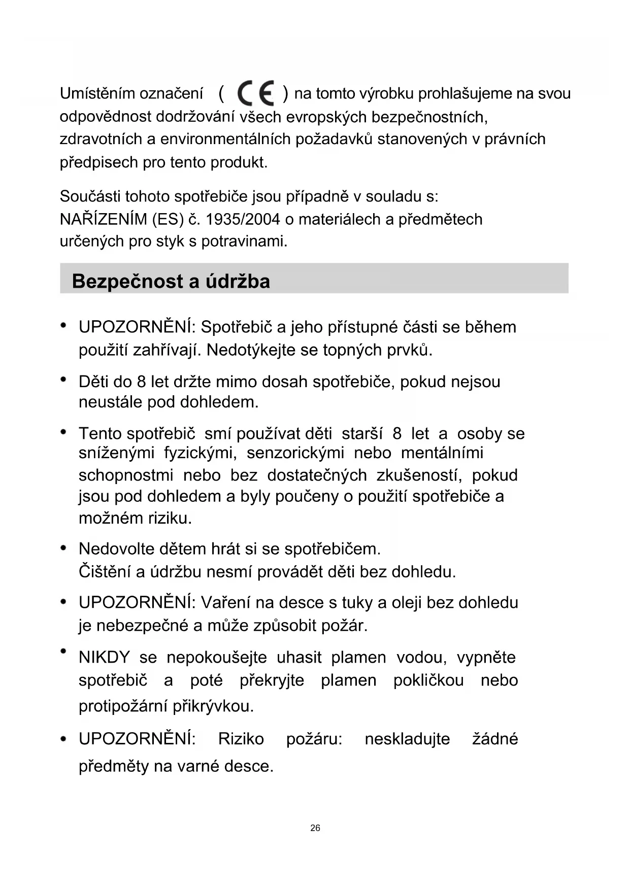 proudu.Po provedení této kontroly znovu pĜístroj zapnout E3/E4 anomálie teploty zkontrolovat varnou nádobu E5/E6 nedostateþ Ĝování tepla nechat pĜístroj vychladnout a poté jej znovu zapnout Tato tabulka obsahuje nejþastČji se vyskytující závady. Nikdy neprovádČjte demontáž varné desky sami, pĜedejdete tak riziku zpĤsobení ještČ vČtších škod. né vyza zkontrolovat p ívod elektrického SERVISNÍ SLUŽBA ZÁKAZNÍKŮM Před žádostí o servisní opravu V případě závady v chodu spotřebiče doporučujeme nejprve: — zkontrolovat zda je zástrčka správně zasunuta v zásuvce elektrického proudu; — zkontrolovat zda závada není popsána v dále uvedené tabulce závad. V případě, že se nepodaří zjistit příčinu závady v chodu: vypnout spotřebič a kontaktovat Technickou servisní službu zákazníkům.37 CECK Dodatek Obsah celého tohoto návodu k použití byl peþlivČ zkontrolován. PĜesto nemĤže výrobce zodpovídat za tiskové chyby nebo výpadky v textu. Dále upozorĖujeme, že pĜípadné revize tohoto návodu k použití mohou být provedeny bez pĜedchozího upozornČní. Ilustrace výrobku se vztahuje k právČ aktuálnímu provedení. POZOR: tento výrobek nesmí být likvidován spoleþnČ s komunálním odpadem. Je tĜeba zajistit jeho likvidaci oddČlenČ. Tento elektrospotĜebiþ byl vyroben v souladu s naĜízením evropské smČrnice 2012/19/EC o likvidaci elektrických a elektronických zaĜízení. Jistota, že tento výrobek byl vyroben za respektování pĜedepsaných naĜízení, napomáhá prevenci možných škod na životním prostĜedí a na zdraví, ke kterým by došlo pĜi nerespektování tohoto naĜízení. Tento symbol znaþí, že tento výrobek nesmí být zlikvidován spoleþnČ s bČžným domácím odpadem, je nutné, aby jeho likvidaci zajistilo nČkteré ze specializovaných recyklaþních center pro elektrický a elektronický materiál. Pro získání potĜebných informací o nakládání s výrobkem a o jeho likvidaci je vhodné kontaktovat místní sbČrné stĜedisko anebo se obrátit na prodejnu, kde byl tento výrobek zakoupen.38 ADVARSEL: Apparatet og dets tilgængelige dele bliver varme ved brug. Undgå berøring med de varme dele. Børn under 8 år skal holdes fra apparatet, med mindre de er under konstant overvågning. Dette apparat kan benyttes af børn fra 8 år og op efter samt af personer med nedsatte fysiske, sensoriske og mentale evner eller mangel på erfaring og viden om brug af apparatet, hvis de overvåges eller får instruktion i brug og forstår de farer, der kan være i forbindelse med brug. Børn må ikke lege med apparatet. Rengøring og vedligeholdelse skal ikke udføres af børn uden overvågning. ADVARSEL: Tilberedning af madvarer med fedtstof eller olie skal holdes under opsyn for at undgå farer eller brand. Prøv ALDRIG at slukke brand med vand. Sluk derimod apparatet og dæk flammerne over med f.eks. et låg eller et brandtæppe. ADVARSEL: Brandfare: Opbevar ikke genstande på kogepladerne. Sikkerhed og vedligeholdelse Afhængigt af forholdene er delene i dette apparat overensstemmende med: FORORDNING (EF) nr. 1935/2004 vedrørende materialer og artikler beregnet til at komme i kontakt med fødevarer.39 placeres på den varme overflade, da de kan blive varme Metaldele som f.eks. Knive, gafler, skeer og låg må ikke