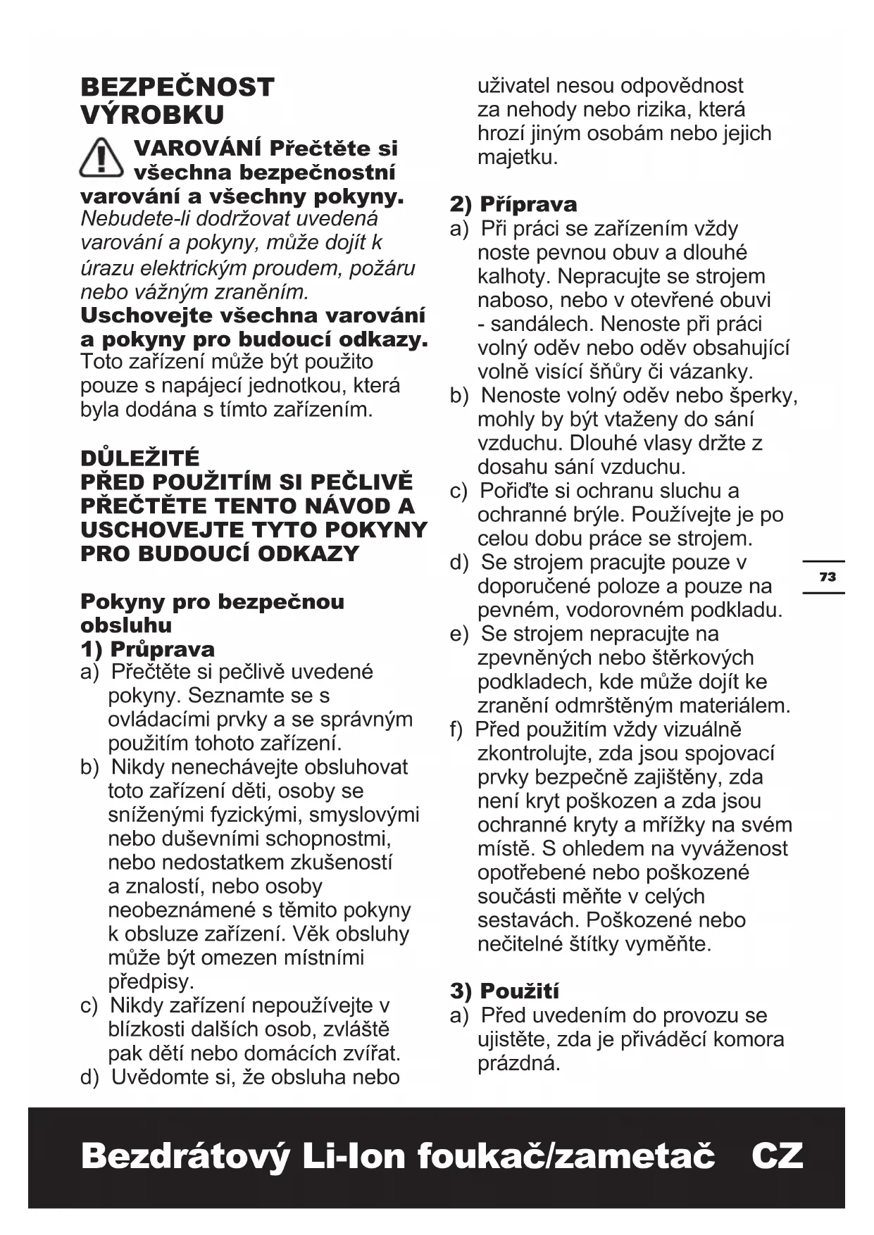 a) Přečtěte si pečlivě uvedené pokyny. Seznamte se s ovládacími prvky a se správným použitím tohoto zařízení. b) Nikdy nenechávejte obsluhovat toto zařízení děti, osoby se sníženými fyzickými, smyslovými nebo duševními schopnostmi, nebo nedostatkem zkušeností a znalostí, nebo osoby neobeznámené s těmito pokyny k obsluze zařízení. Věk obsluhy může být omezen místními předpisy. c) Nikdy zařízení nepoužívejte v blízkosti dalších osob, zvláště pak dětí nebo domácích zvířat. d) Uvědomte si, že obsluha nebo uživatel nesou odpovědnost za nehody nebo rizika, která hrozí jiným osobám nebo jejich majetku.