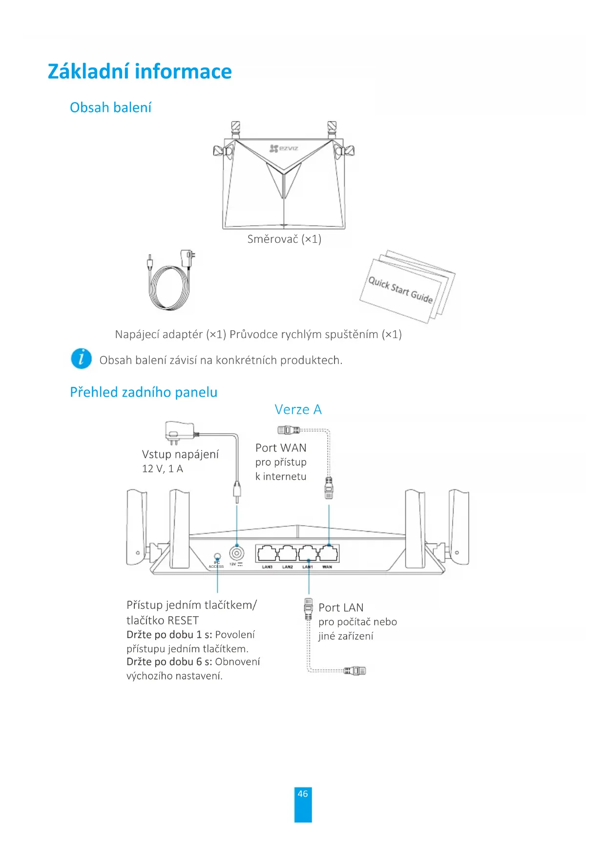 για να συνδεθείτε στο Wi-Fi.46 Základní informace Obsah balení Směrovač (×1) Napájecí adaptér (×1) Průvodce rychlým spuštěním (×1) Obsah balení závisí na konkrétních produktech. Přehled zadního panelu Verze A IPC ACCESS Vstup napájení 12 V, 1 A Přístup jedním tlačítkem/ tlačítko RESET Držte po dobu 1 s: Povolení přístupu jedním tlačítkem. Držte po dobu 6 s: Obnovení výchozího nastavení. Port WAN pro přístup k internetu Port LAN pro počítač nebo jiné zařízení47 Verze B Port WAN pro přístup k internetu Vstup napájení 12 V, 1,5A Port LAN pro počítač nebo jiné zařízení Přístup jedním tlačítkem/ tlačítko RESET Držte po dobu 1 s: Povolení přístupu jedním tlačítkem Držte po dobu 6 s: Obnovení výchozího nastavení Zapnu/vypnu *USB Port pro disk USB nebo přenosný HDD atd.