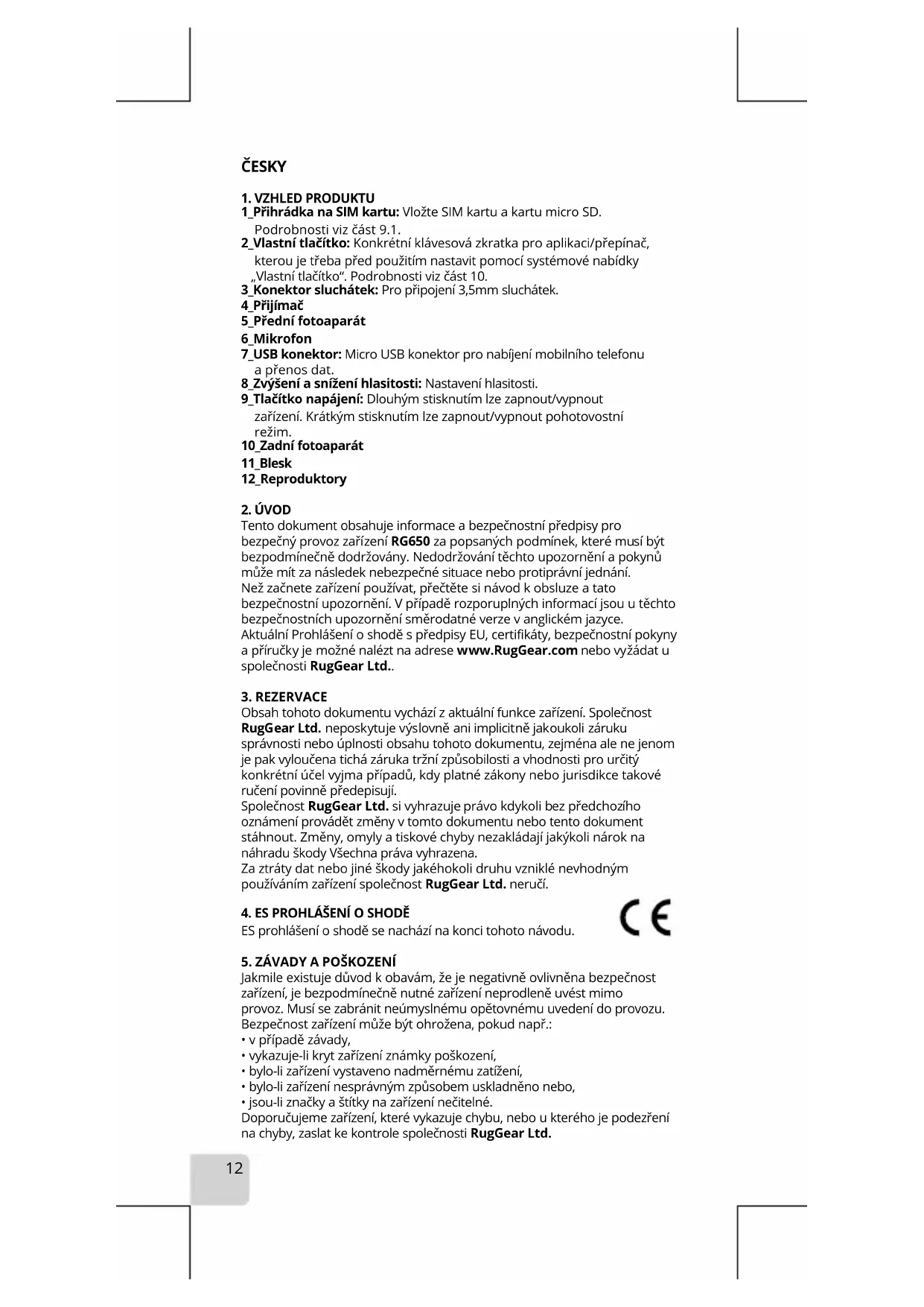Tento dokument obsahuje informace a bezpečnostní předpisy pro bezpečný provoz zařízení RG650 za popsaných podmínek, které musí být bezpodmínečně dodržovány. Nedodržování těchto upozornění a pokynů může mít za následek nebezpečné situace nebo protiprávní jednání. Než začnete zařízení používat, přečtěte si návod k obsluze a tato bezpečnostní upozornění. V případě rozporuplných informací jsou u těchto bezpečnostních upozornění směrodatné verze v anglickém jazyce. Aktuální Prohlášení o shodě s předpisy EU, certifikáty, bezpečnostní pokyny a příručky je možné nalézt na adrese www.RugGear.com nebo vyžádat u společnosti RugGear Ltd..
